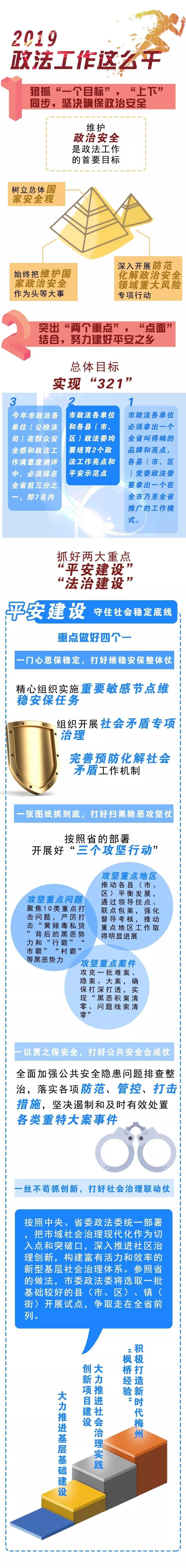 会上,市委常委、政法委书记陈俊钦对今年政法工作作出具体安排。他强调,要坚持稳中求进总基调,加快推进社会治理现代化、政法领域全面深化改革、政法队伍建设,坚决维护国家政治安全、确保社会大局稳定、促进社会公平正义、保障人民安居乐业,推动全市政法工作同步走在全省前列,加快建设名副其实、声名远扬的“平安之乡”,把梅州建设成全省最安全稳定、最公平正义、法治环境最好的地区之一,努力为广东实现“四个走在全国前列”,当好“两个重要窗口”作出梅州政法的担当和贡献。