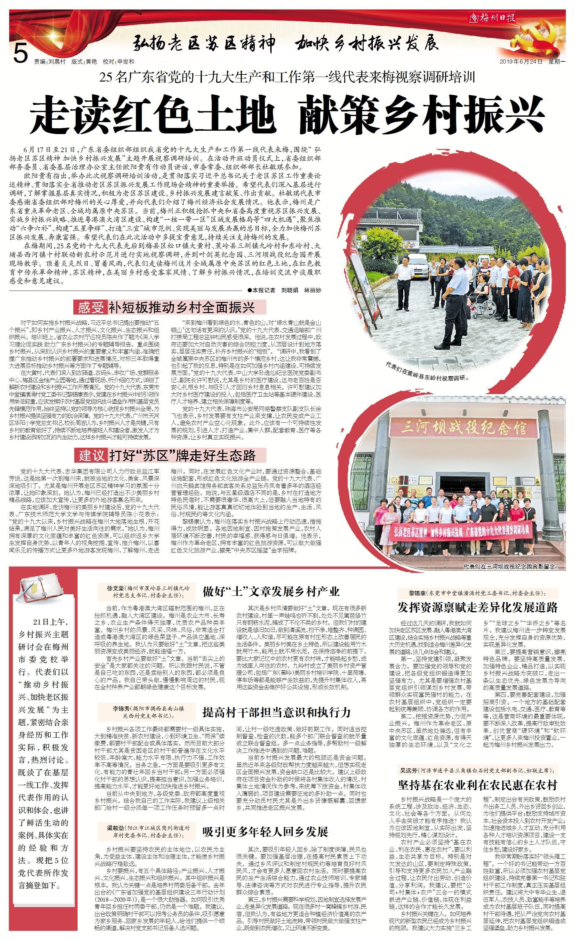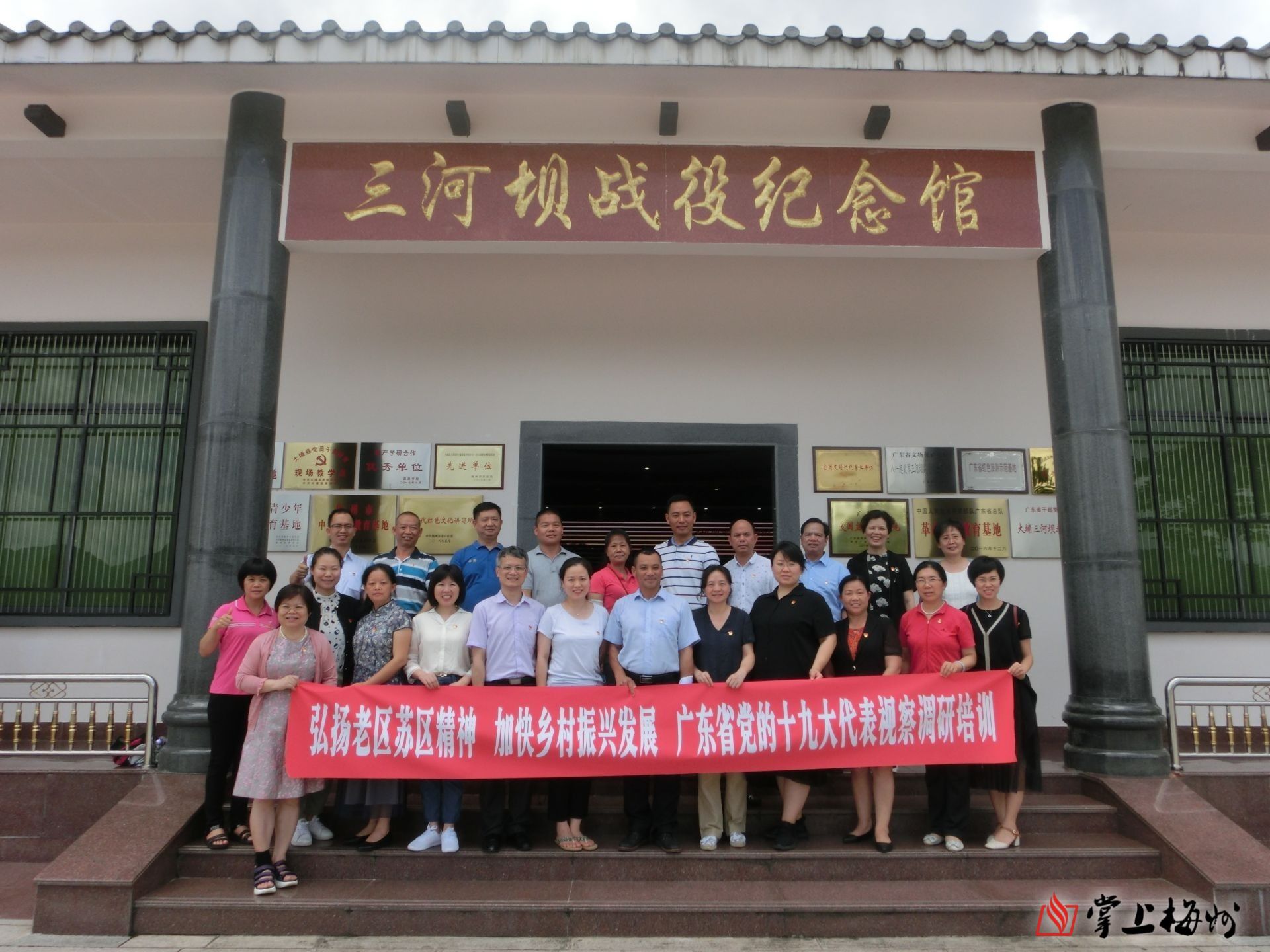 在梅期间,25名党的十九大代表先后到梅县区松口镇大黄村、蕉岭县三圳镇九岭村和东岭村、大埔县西河镇十村联动新农村示范片进行实地视察调研,并到叶剑英纪念园、三河坝战役纪念园开展现场教学。顶着炎炎烈日、冒着风雨,代表们走读梅州这片全域属原中央苏区的红色土地,在红色教育中传承革命精神、苏区精神,在美丽乡村感受客家风情、了解乡村振兴情况,在培训交流中谈履职感受和意见建议。