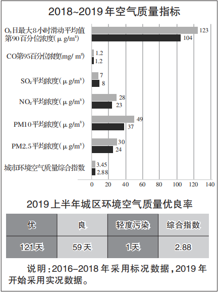 上半年,我市城区环境空气质量(实况)优良率99.4%,其中优121天、良59天、轻度污染1天,综合指数为2.88,排名全省第7名。其中,PM2.5、PM10、NO2、O3浓度分别为24、37、23、104微克/立方米,同比下降25.0%、24.5%、11.5%、8.8%。这些指标的下降,与扬尘治理、散乱污治理、烟花爆竹禁燃规定执行、工业大气排放管理、机动车排放管理有着紧密的联系。