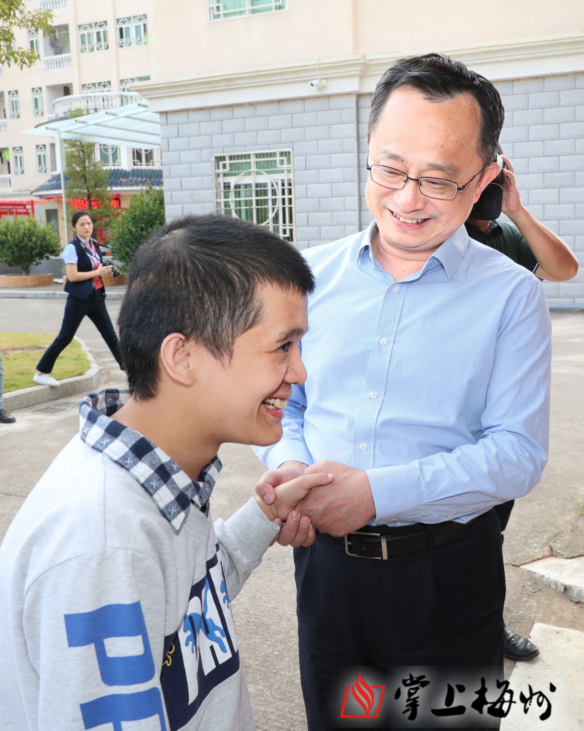在五华县儿童福利院,陈敏握着一儿童的手了解日常生活情况。