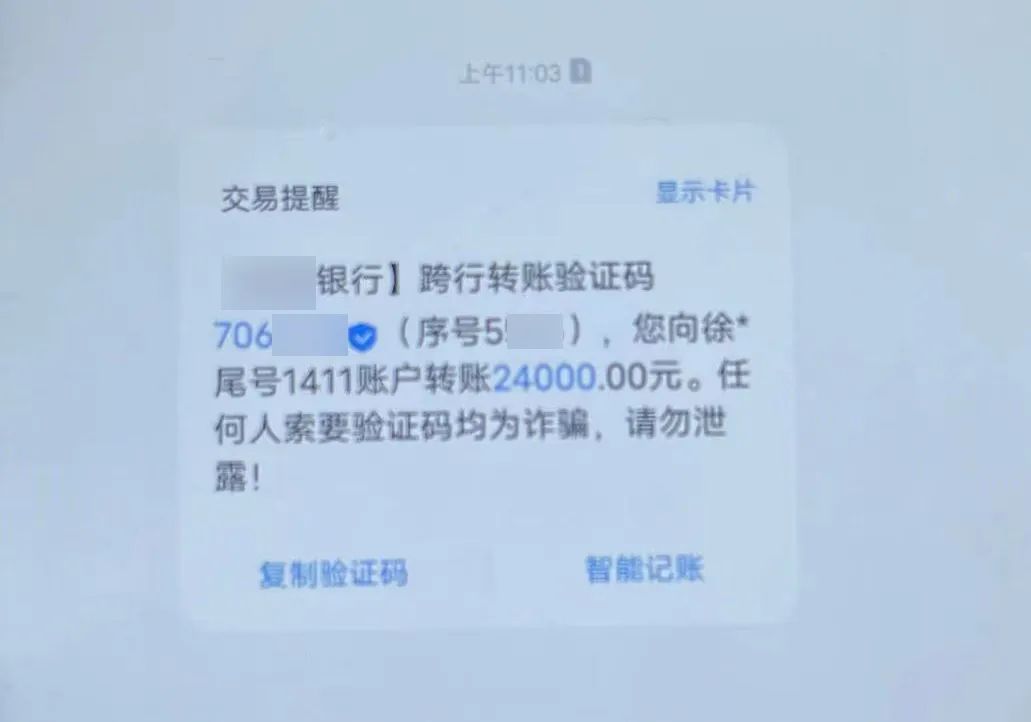 在对方的诱骗下,夏女士将自己的银行卡卡号、密码以及验证码均告诉了对方。随后,夏女士就收到了银行卡向陌生人转账24000元的短信,短信中还写着“任何人索要验证码均为诈骗,请勿泄露”,想到自己刚刚把验证码告诉对方,钱就被转走了,这时的夏女士才幡然醒悟这一切都是骗局。