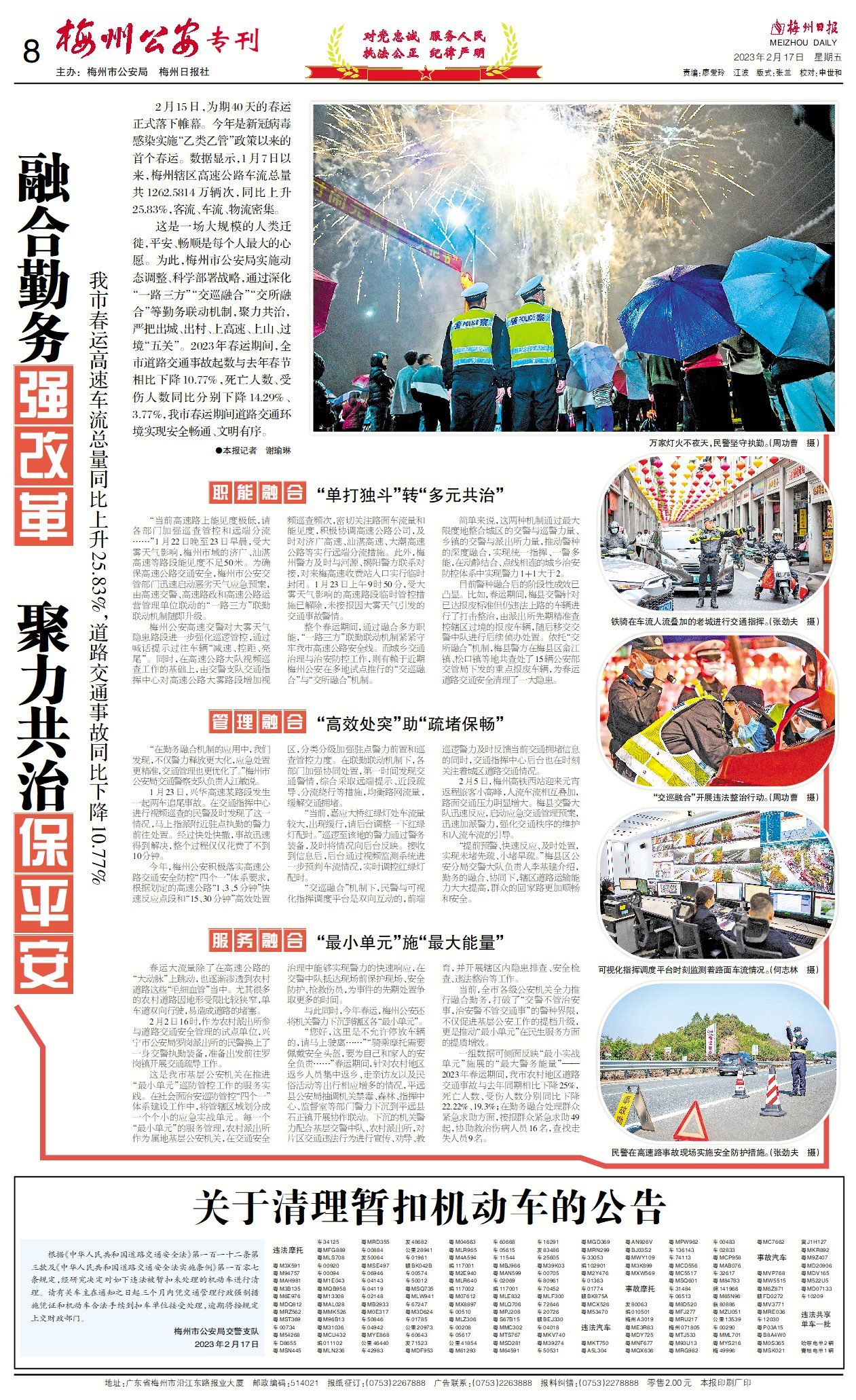 整个春运期间,通过融合多方职能,“一路三方”联勤联动机制紧紧守牢我市高速公路安全线。而城乡交通治理与治安防控工作,则有赖于近期梅州公安在多地试点推行的“交巡融合”与“交所融合”机制。