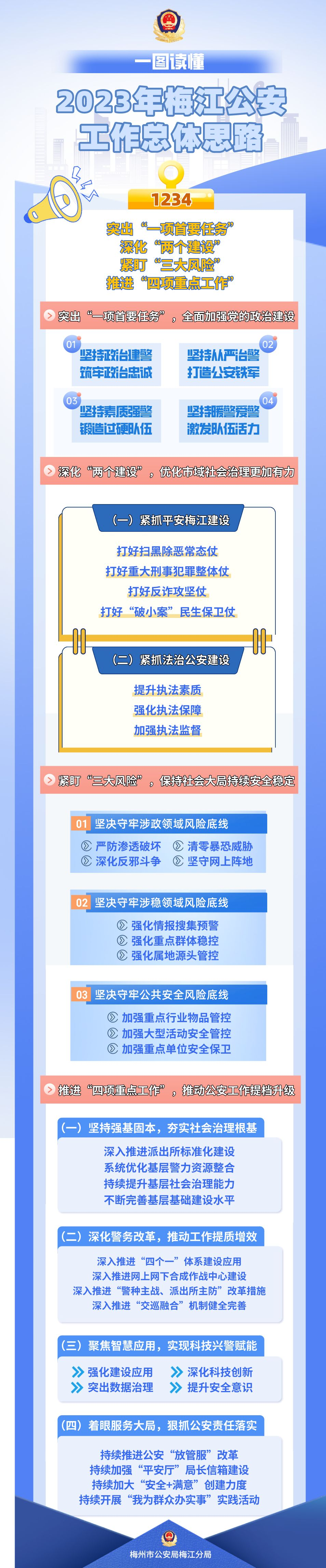 会议强调,全警上下要以习近平新时代中国特色社会主义思想为指导,全面贯彻落实党的二十大精神,深入贯彻习近平法治思想特别是习近平总书记关于新时代公安工作的重要论述,贯彻落实中央、省委、市委、区委政法工作会议,以及全国公安厅局长会议、全省公安局长会议、全市公安工作会议和市委八届六次全会、区委九届四次全会精神,深刻领悟“两个确立”的决定性意义,增强“四个意识”、坚定“四个自信”、做到“两个维护”,严格对标省厅“六大能力”“四个建设”和市局“十个聚力”部署要求,统筹安全和发展,奋力推进梅江公安工作现代化,为全区加快打造高质量发展示范区创造更加安全稳定的政治社会环境。