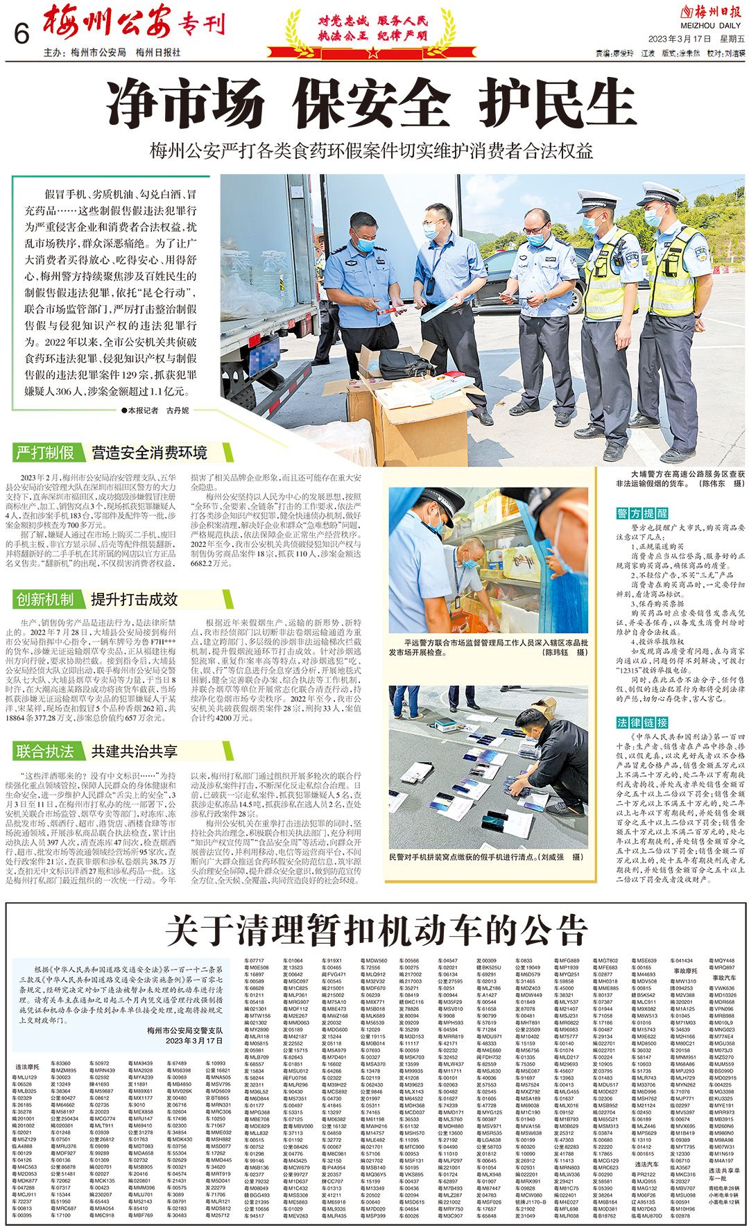 梅州公安机关在重拳打击违法犯罪的同时,坚持社会共治理念,积极联合相关执法部门,充分利用“知识产权宣传周”“食品安全周”等活动,向群众开展普法宣传,并利用移动、电信等运营商平台,不间断向广大群众推送食药环假安全防范信息,筑牢源头治理安全屏障,提升群众安全意识,做到防范宣传全方位、全天候、全覆盖,共同营造良好的社会环境。
