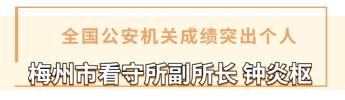 钟炎枢,1990年参加公安工作,从警33年。从事监管工作10年来,钟炎枢与时俱进,大胆创新,以自身正、自身净、自身硬的实际行动,忠诚履职、扎实工作,使看守所面貌焕然一新,队伍管理、监所安全、服务保障、执法规范等工作位列前茅,获得了领导同事的高度赞扬和一致肯定, 荣获个人二等功、三等功、优秀公务员、优秀共产党员等荣誉称号,2017年被评为全国公安监管成绩突出个人受到公安部表彰。