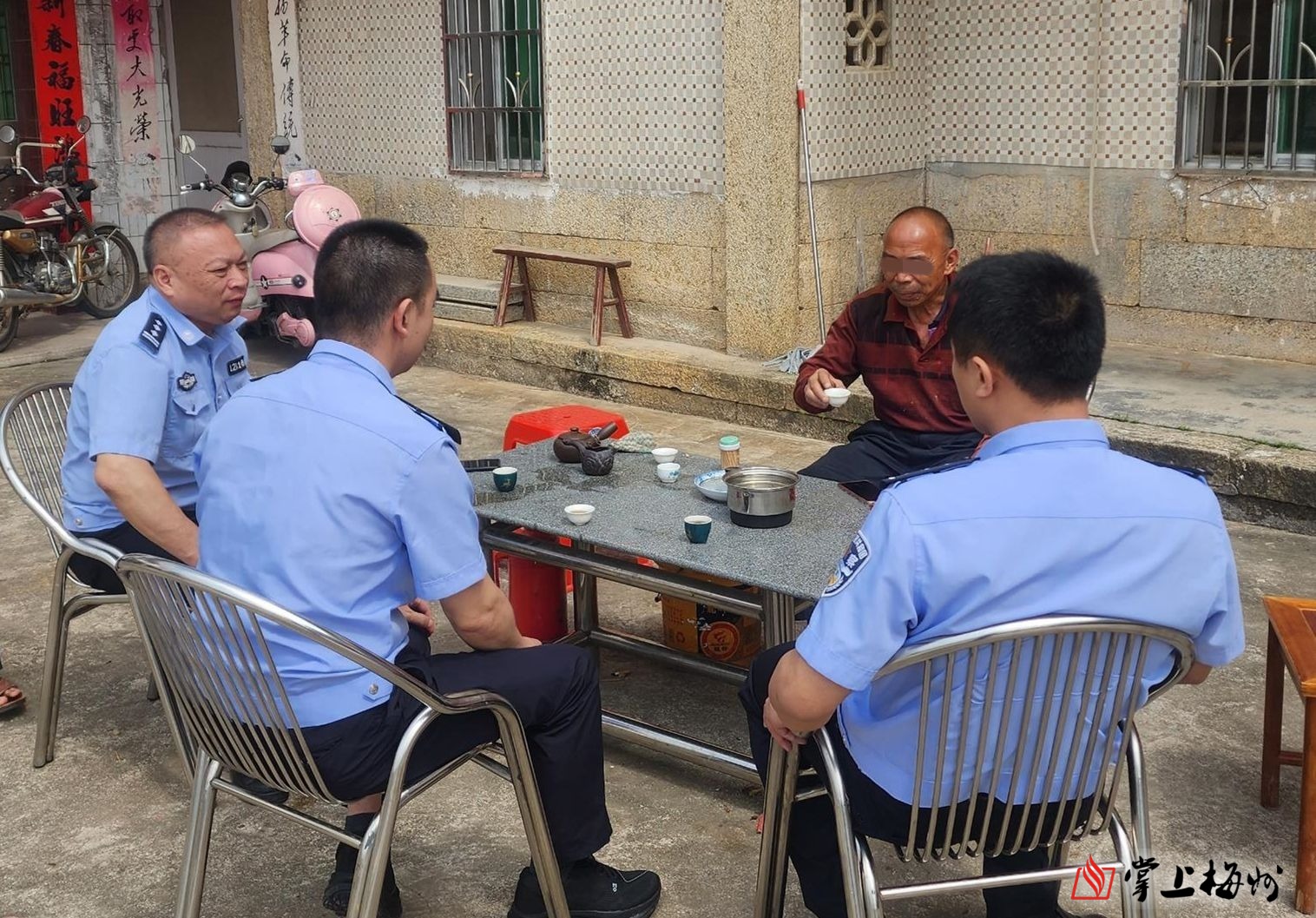5月10日上午,在棉洋镇一户农家门前,一张简易茶几旁,摆了数张凳子,农户烧了热茶,同样为棉洋镇人的反诈工作组3名民警与农户拉近“心”距离,在举杯喝茶聊天间隙,便完成了一场面对面的反诈宣传活动。