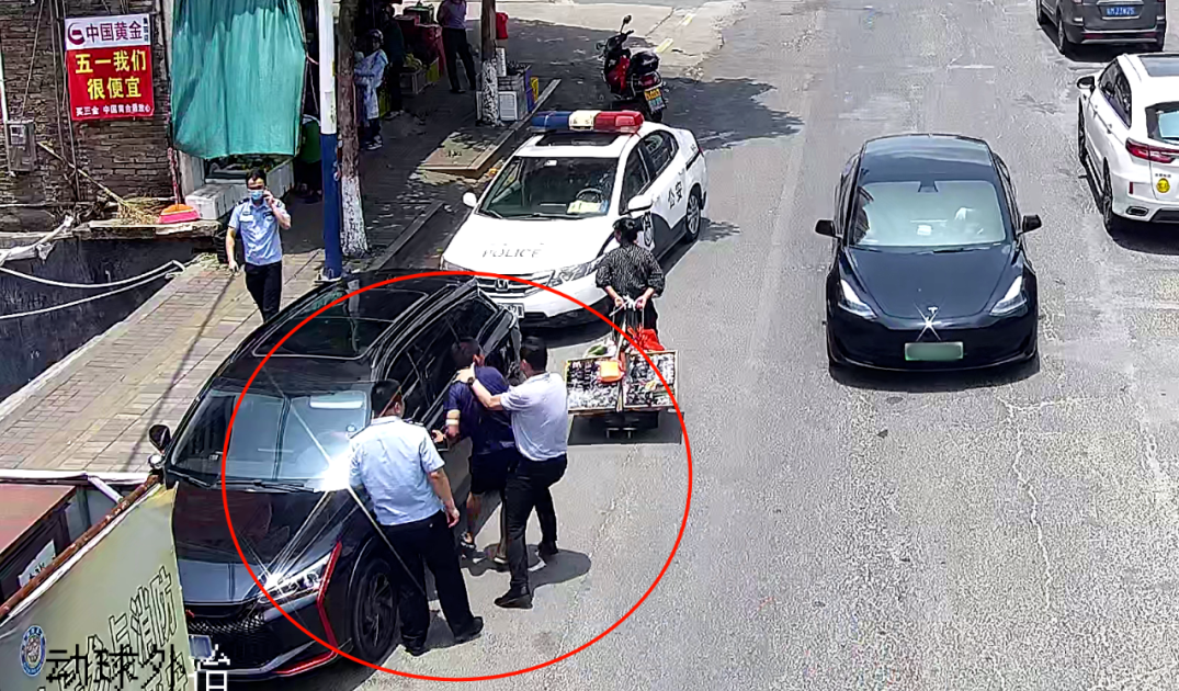 5月22日11时40分许,在五华县河东镇大新街与水梅路的交叉路上,一辆警车靠边停放,两位民警正对一辆亮着双闪灯的黑色车进行拍照,看似是对违停车辆固定证据,殊不知还有一位着便装的民警在对面饭店门口蹲守,一张抓捕大网正在张开。
