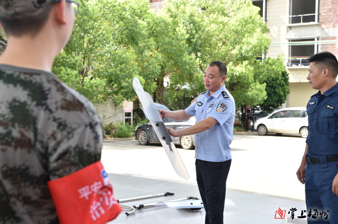 潘峥锋(中)为三角镇梅塘村联防队员讲解盾牌、钢叉的使用方法。(邹蔼璇 摄)