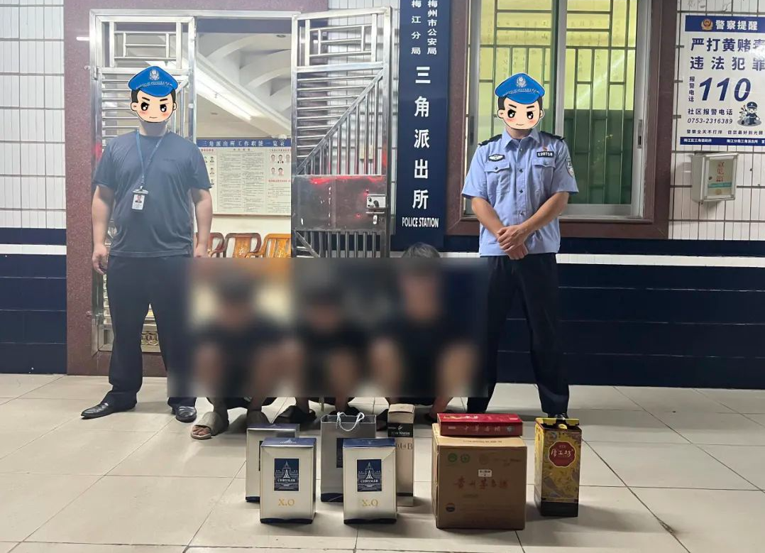 于是,民警以案发现场监控视频线索为切入点,对案发地周边开展走访调查和取证,并结合掌握的线索,对作案手段和作案对象进行分析研判,最终锁定了作案嫌疑人的身份信息。当晚21时,办案民警在梅江区三角镇上坪安置区附近抓获涉嫌盗窃车内财物的冯某、曾某、刘某等三人,追回被盗名酒一批。