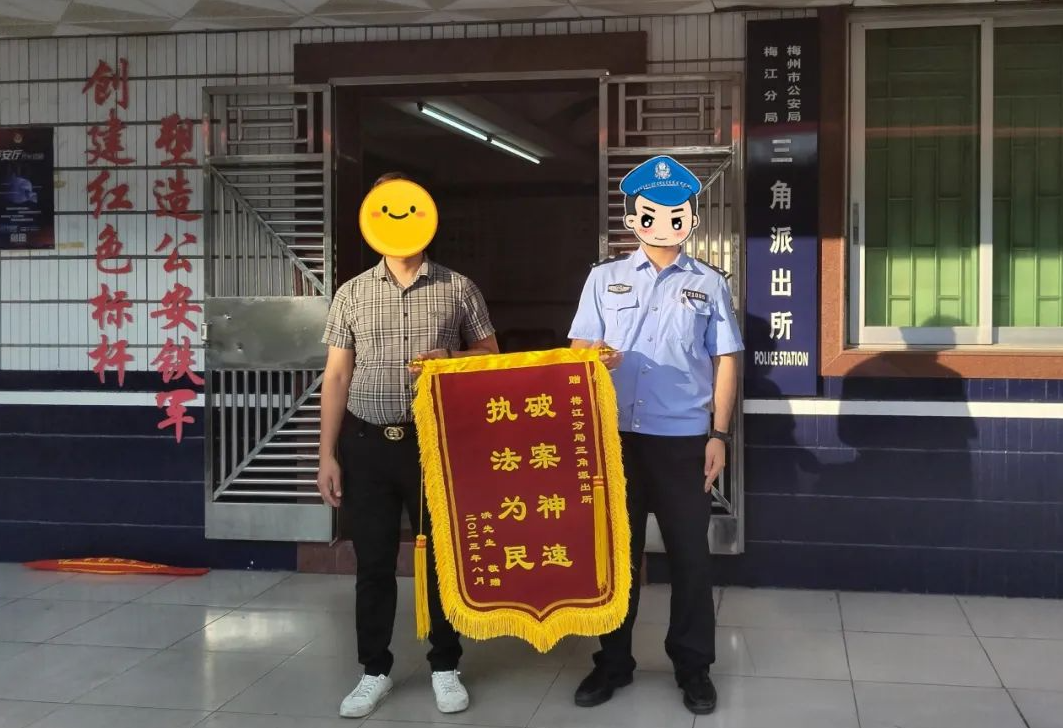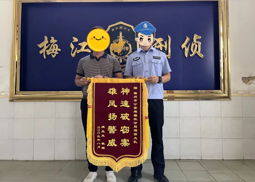 8月7日,事主洪先生特地制作了两面写有“神速破窃案 雄风扬警威”“破案神速 执法为民”字样的锦旗,先后送到分局刑侦大队和三角派出所,感谢办案民警破案神速、心系群众,为其挽回全部经济损失。