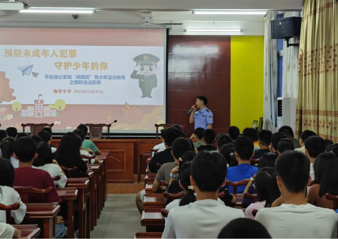 10月25日,县公安局“向阳花”宣讲团队成员来到梅青中学,开展了以预防未成年人违法犯罪为主题的“向阳花”青少年法治教育宣传主题活动。