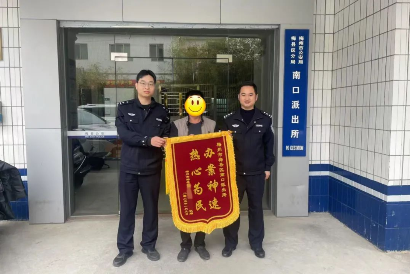2月18日上午,扶大某交通拯救队工作人员专程到梅县区公安分局南口派出所,将一面印有“办案神速 热心为民”的锦旗送到办案民警手中,感谢他们快速破案,追回被盗汽车。