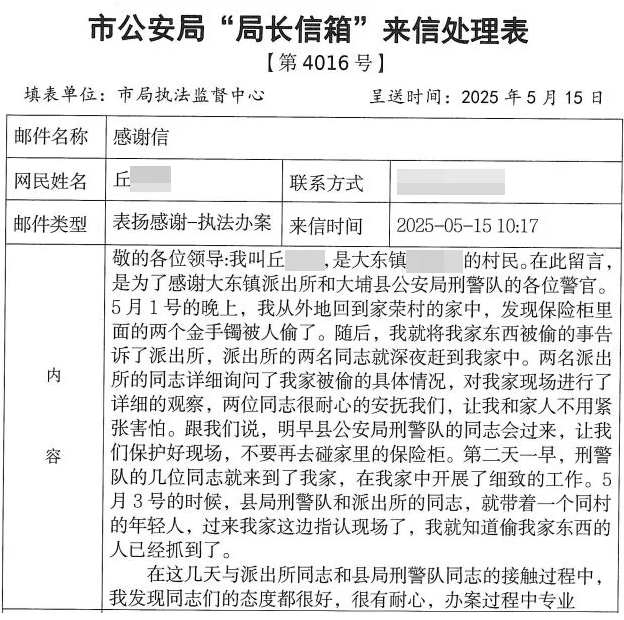 近日,大埔县公安局接连收到两封来自群众的感谢信,字里行间满是真情实感。这不仅是对办案民警的褒奖,更是对大埔公安队伍“为民服务”初心的肯定。