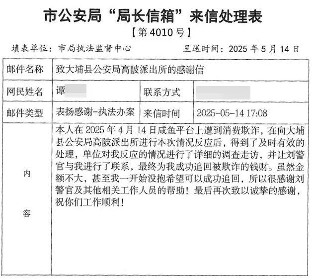 “金额不大,甚至一开始没抱希望可以成功追回,真的很感谢高陂派出所的帮助!”谭先生欣喜之余,特意写信感谢。