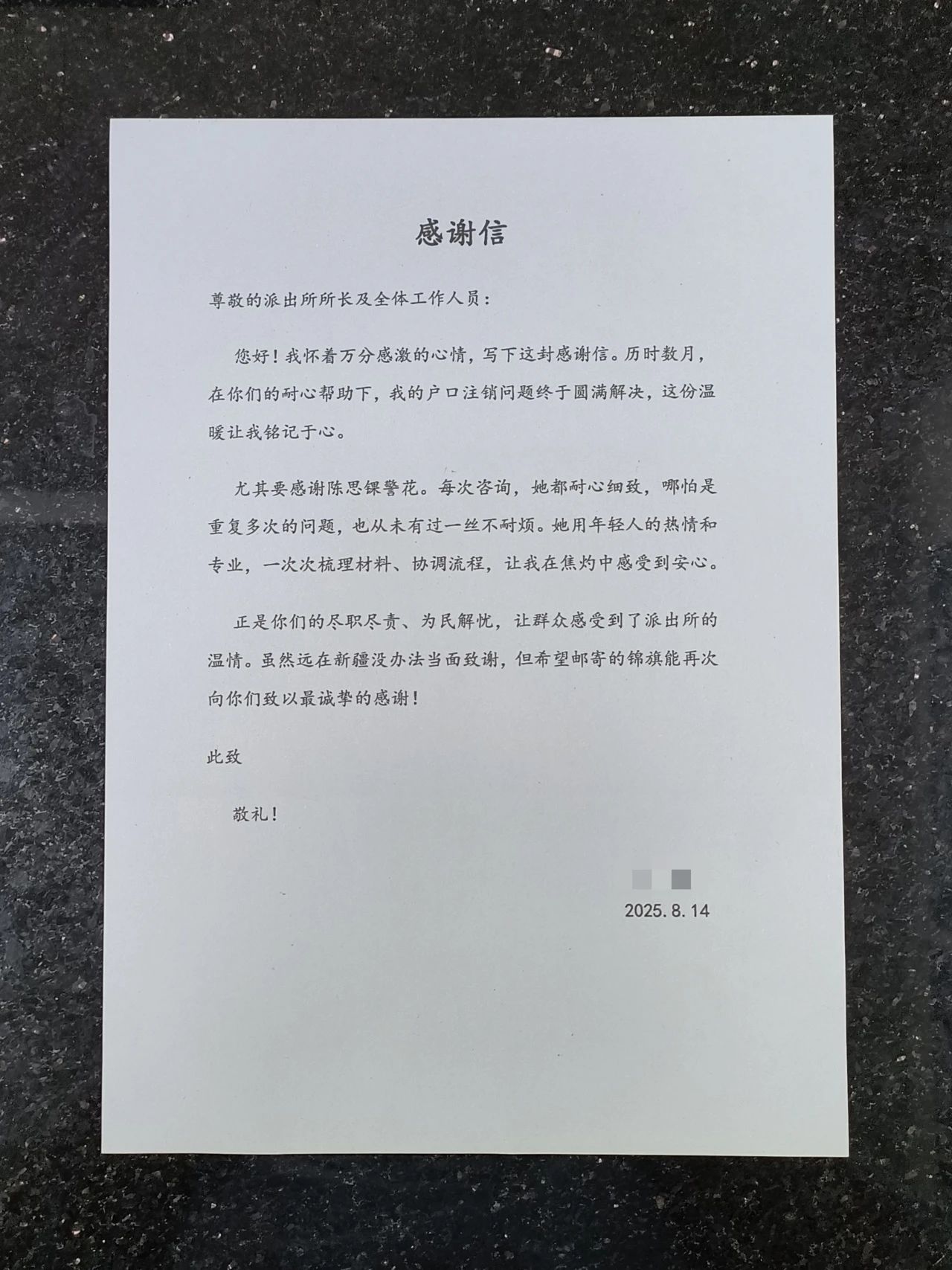 8月20日,远在新疆的群众张女士委托亲属张先生将一面印有“尽职尽责办实事,高效为民解难题”的锦旗和一封感谢信送到了梅州市公安局梅县分局石扇派出所民警手中,以此表达对该所全体民辅警的感激之情。