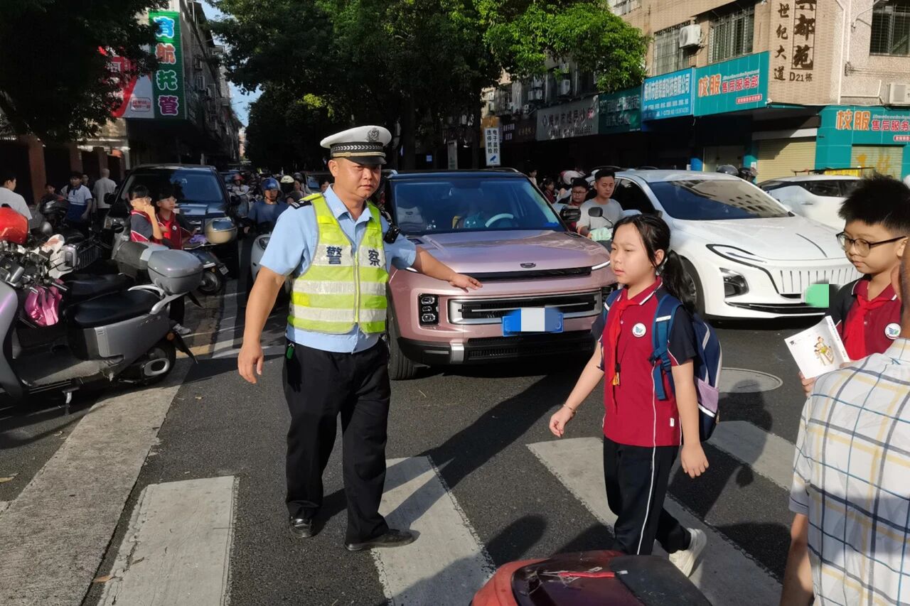 交警穿梭于人流车流中,指挥交通、疏导车辆、维护秩序,守护孩子们过马路,那一抹蓝,是开学路上最安心的颜色。