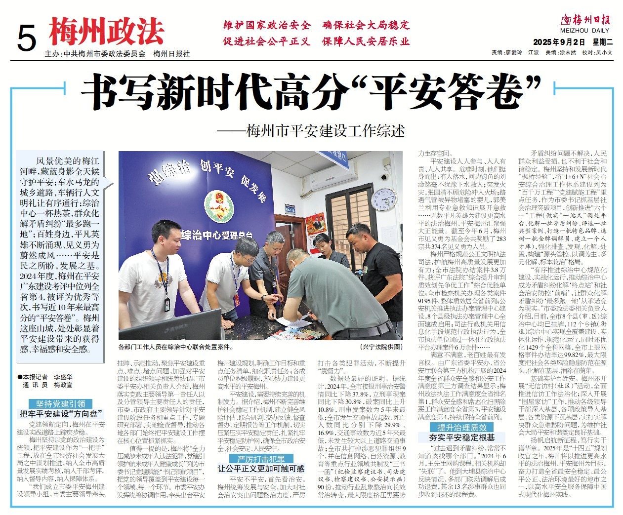 风景优美的梅江河畔,藏蓝身影全天候守护平安;车水马龙的城乡道路,车辆行人文明礼让有序通行;综治中心一杯热茶,群众化解矛盾纠纷“最多跑一地”;百姓身边,平凡英雄不断涌现、见义勇为蔚然成风……平安是民之所盼,发展之基。2024年度,梅州在平安广东建设考评中位列全省第4,被评为优秀等次,书写近10年来最高分的“平安答卷”。梅州这座山城,处处彰显着平安建设带来的获得感、幸福感和安全感。