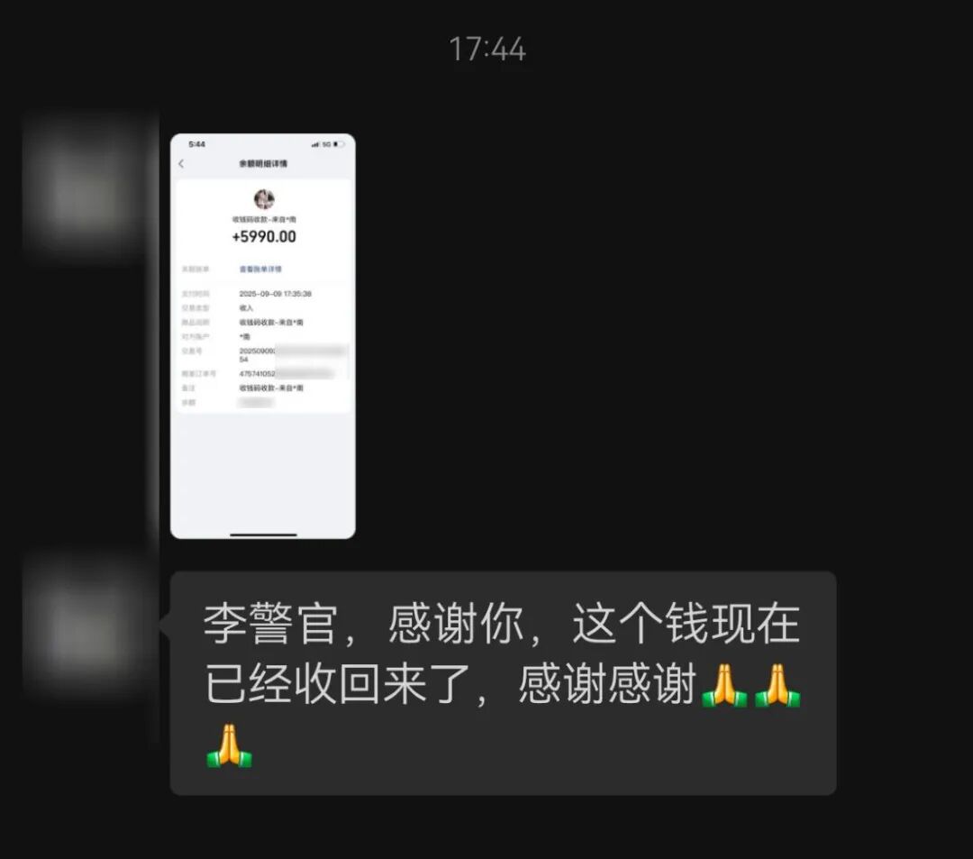“当时也没感觉自己被骗,只是想着继续支付,将自己的本金和佣金赚回来。如果不是你们及时帮忙,我这笔钱就打水漂了……”看到失而复得的钱款,李先生激动地向民警发来信息道谢。