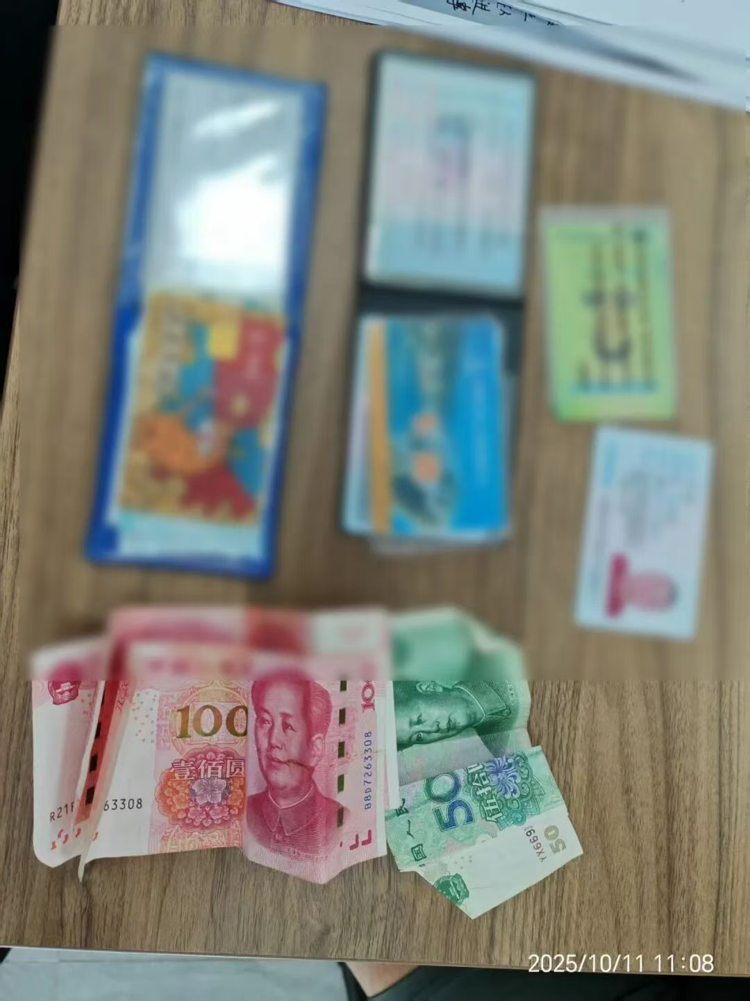 10月11日上午,热心群众李女士(化名)在万达广场入口处的地面上,意外发现一个鼓鼓的证件包,经查看发现里面有若干现金,且整齐排列着身份证、驾驶证、数张工作证。
