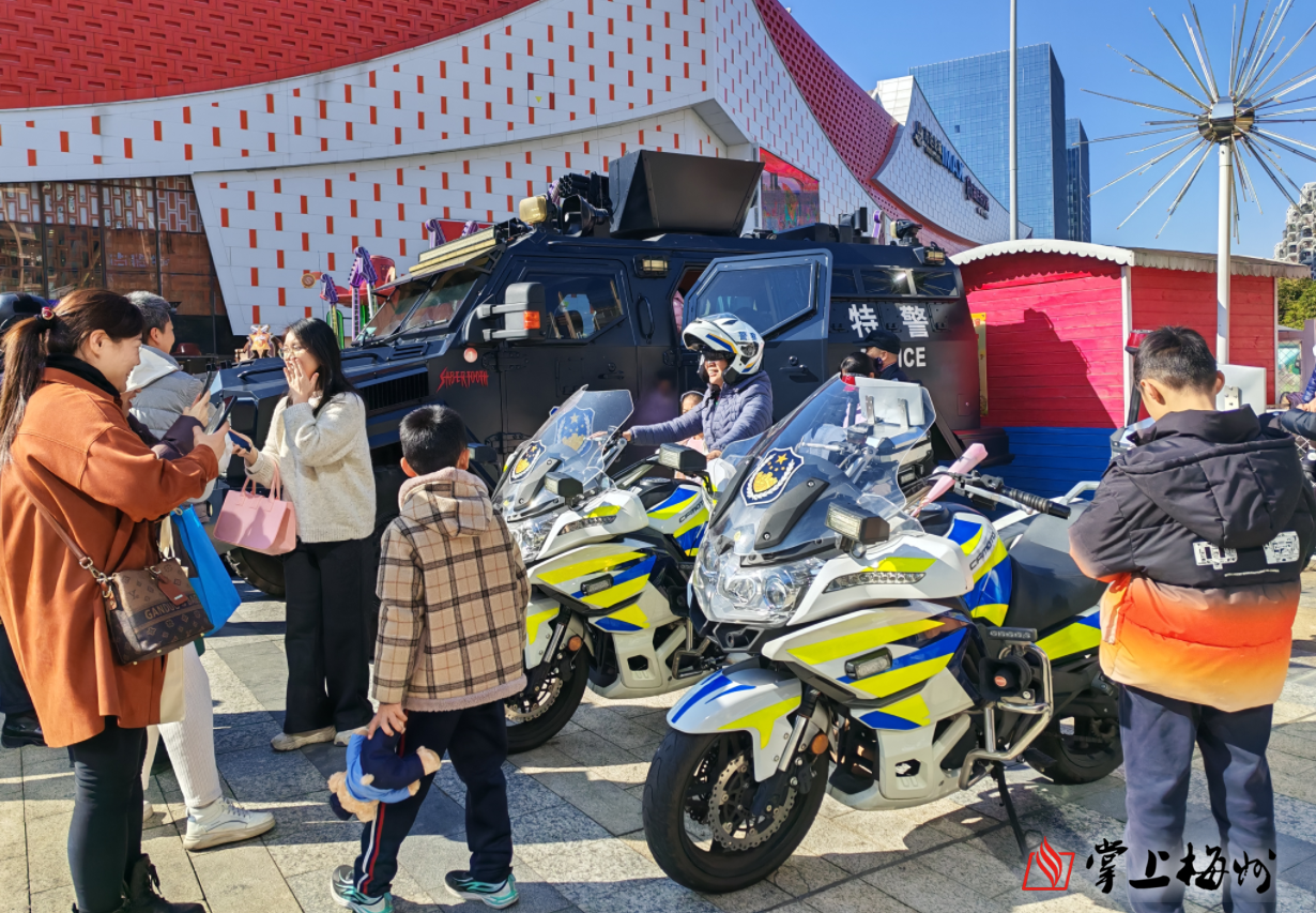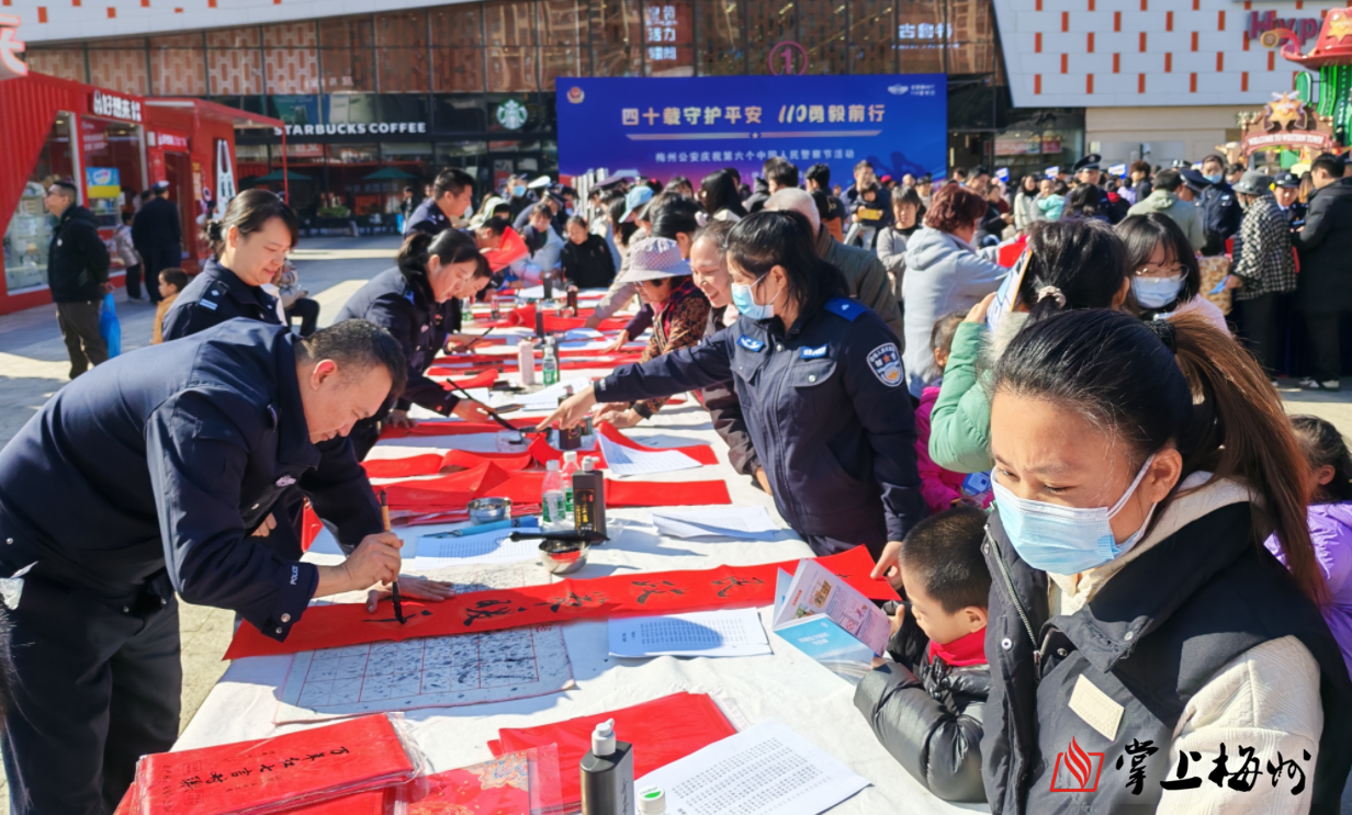 在梅城万达广场,梅州市公安局民警通过多种形式与群众互动交流,现场讲解禁毒、防盗、反诈及交通安全等实用知识,普及公安业务办理流程;集中展示特警防暴车、警犬、交警铁骑等先进警用装备,吸引众多群众驻足观看、合影留念;同时还组织开展了书写春联、赠送“福”字、110接处警知识及各警种业务有奖问答等趣味活动。