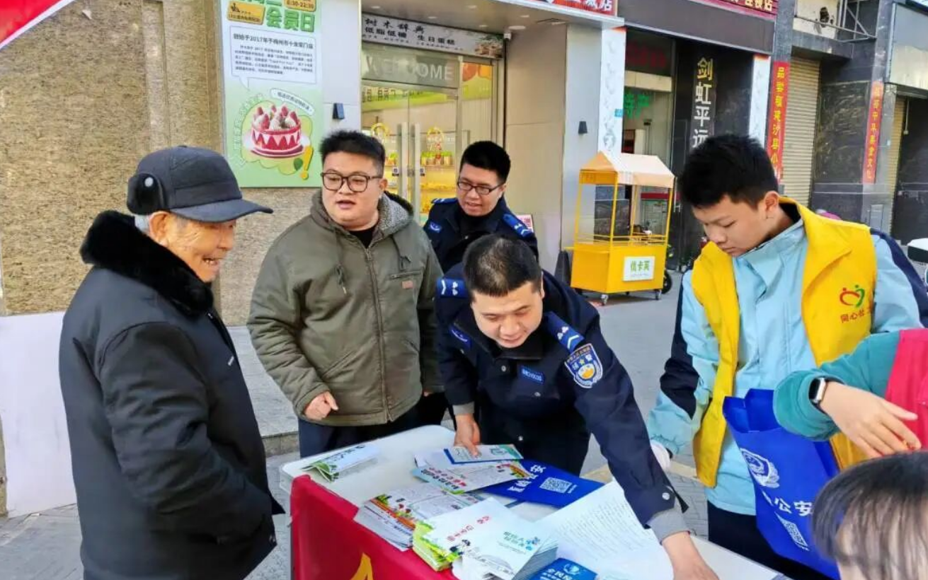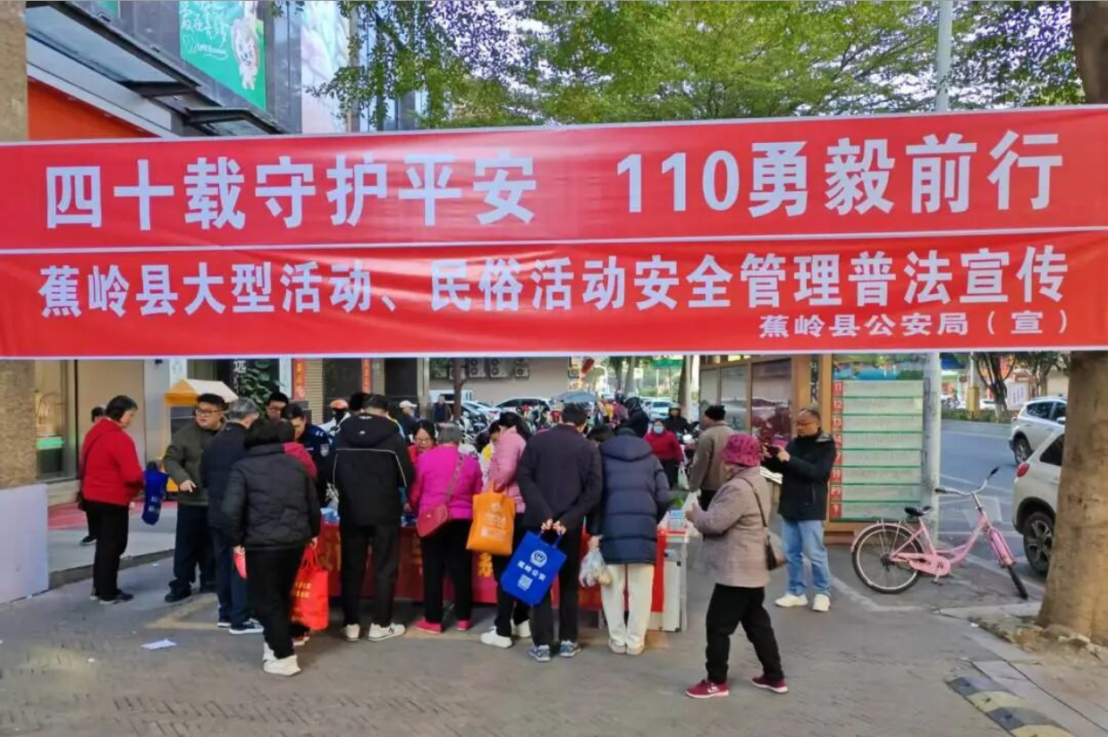 与此同时,蕉岭县公安局在上城商贸中心开展了以“四十载守护平安 110勇毅前行”为主题的“110宣传日”系列宣传活动。通过悬挂横幅、发放宣传资料等方式,向群众详细介绍如何正确拨打110 报警,恶意骚扰110的危害和需要承担的法律责任,引导广大群众正确使用110报警电话,将有限的警务资源留给最需要的人。活动现场还深入宣传了防电信诈骗、防盗、禁毒及交通安全等方面的安全防范知识,进一步提升辖区群众的安全防范意识,有效预防和减少各类案件的发生,确保辖区安全稳定。