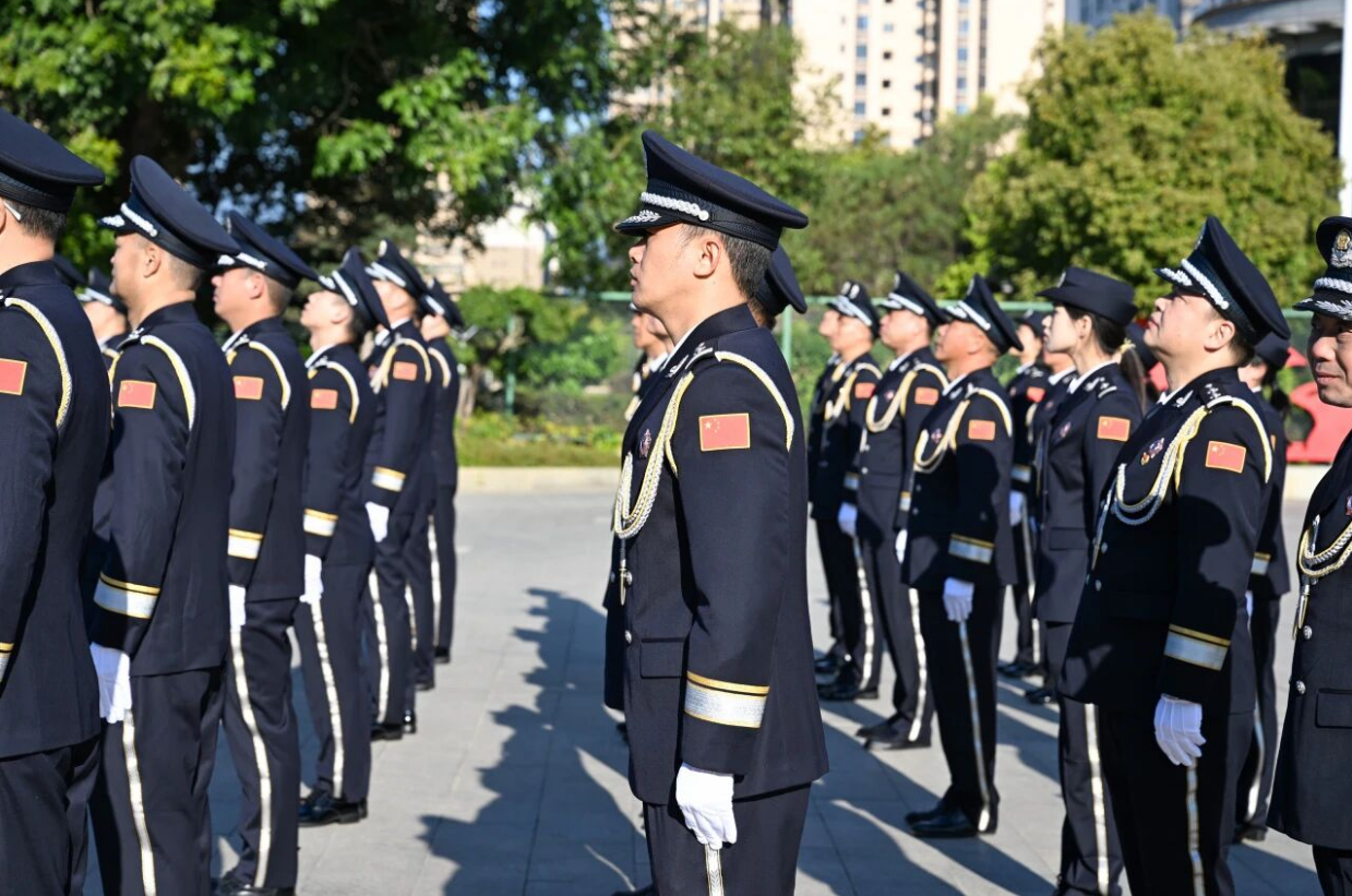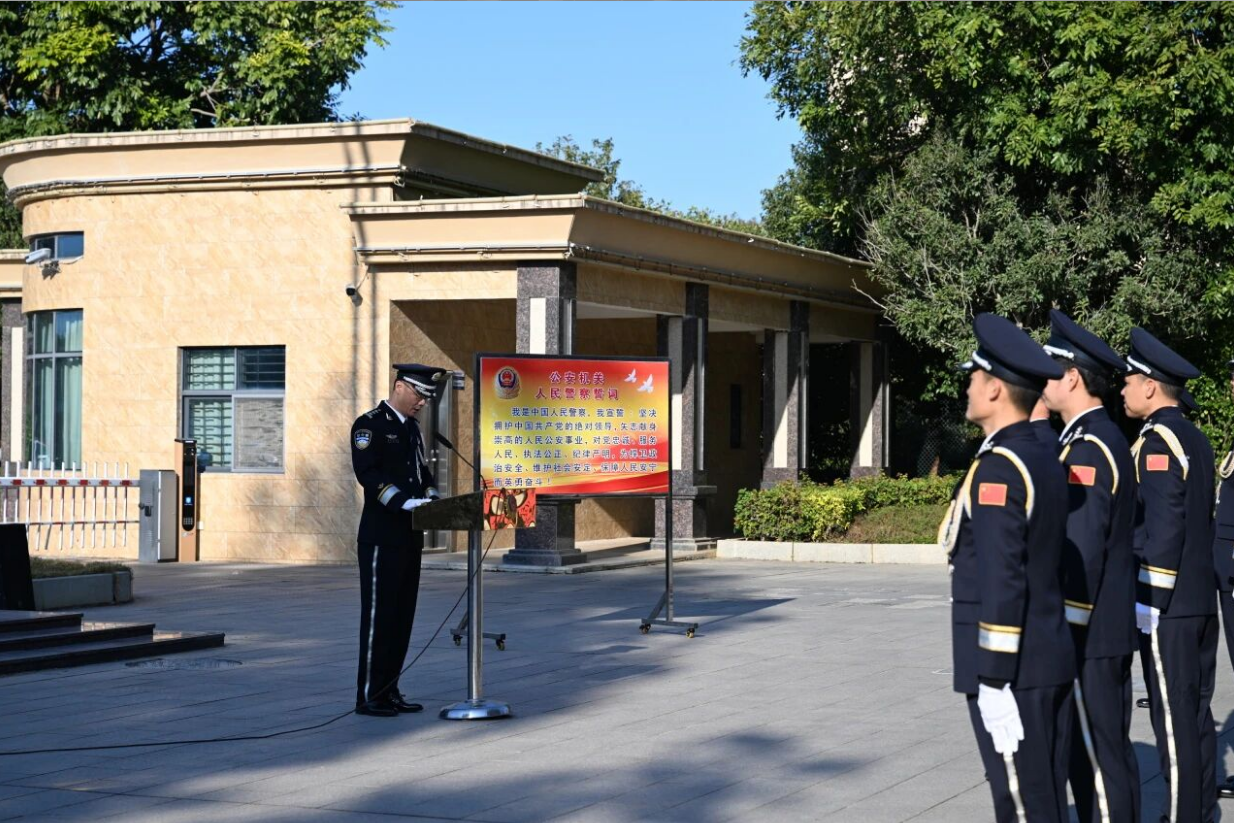 上午9时,参加仪式全体民警整齐列队,精神抖擞。在清脆嘹亮的口令指挥下,护旗队员迈着坚实而雄健的步伐护卫着警旗走向升旗台,伴随着振奋昂扬的《中国人民警察警歌》响起,鲜艳的中国人民警察警旗冉冉升起、迎风飘扬。全体民警面向警旗,致以崇高的敬礼。“我是中国人民警察,我宣誓!”在领誓人的带领下,全体民警高举右拳,重温入警誓词。铿锵誓言在大院上空久久回荡,振奋人心,表达了对党的无限忠诚及对人民警察事业的无限热爱。