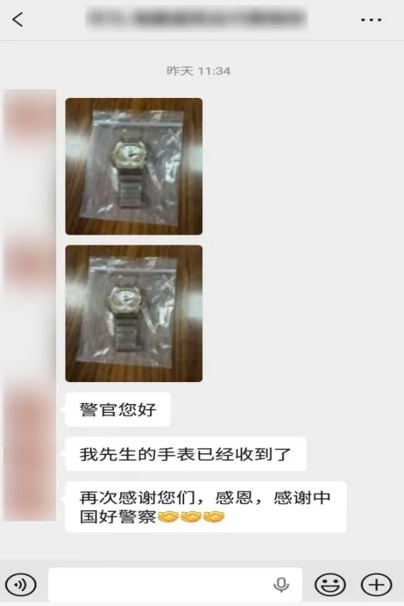 “警官您好!我先生的手表已经收到了,再次感谢你们,感恩感谢中国好警察!”三天后,熊女士终于顺利收到了失而复得的手表,并通过微信向民警发送信息,表达诚挚谢意。