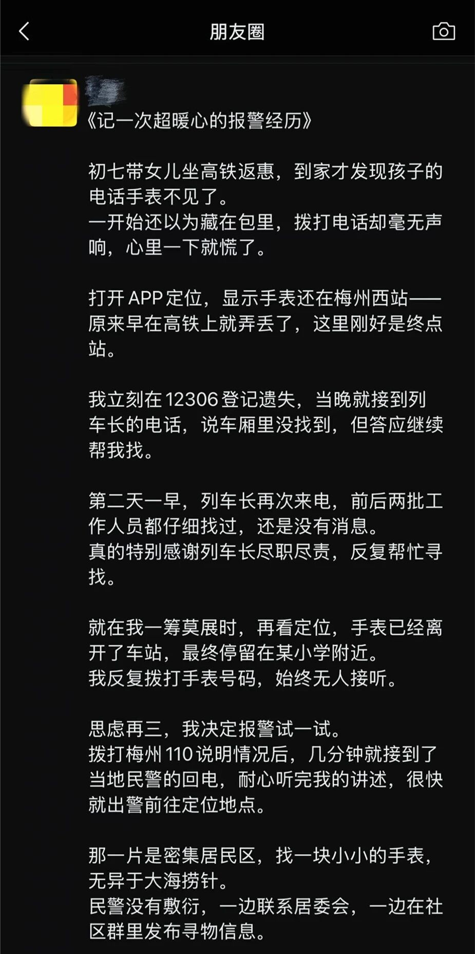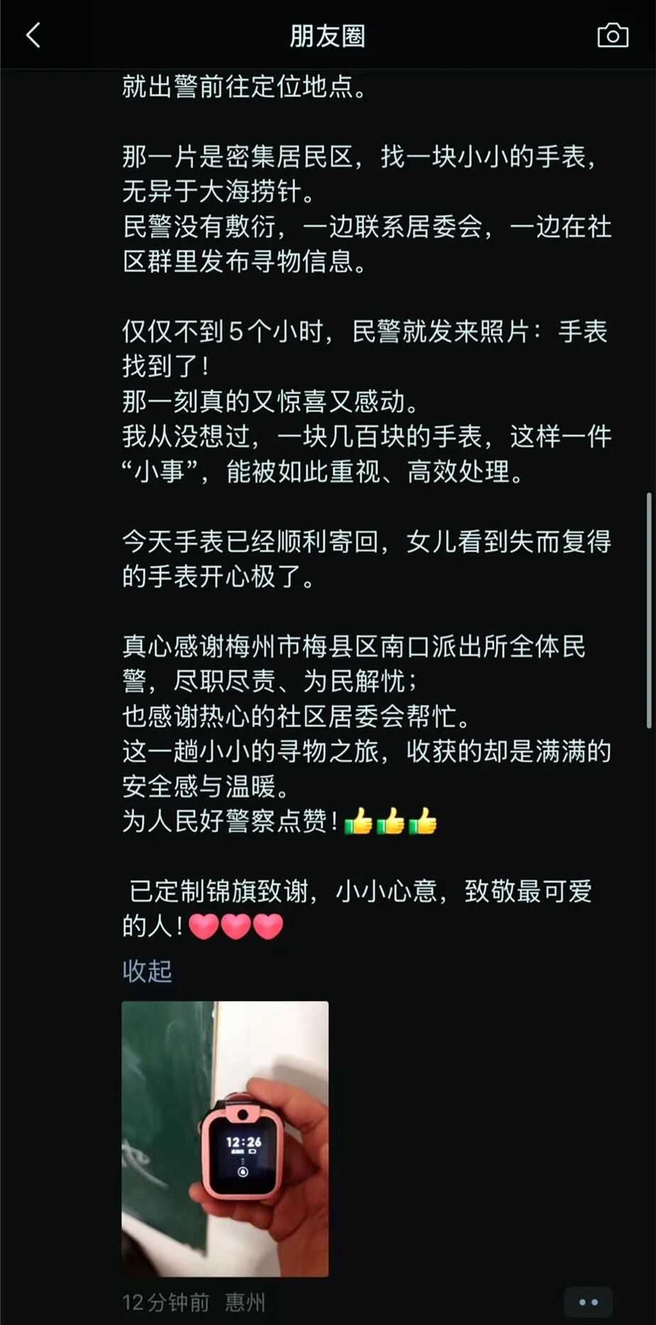 一块小小的电话手表,折射出梅县公安民警认真负责、细致高效的工作作风,用不到半天的时间跑出了一条“爱心速递线”,不仅让失物重回孩子手中,也把“小事”办出了暖意、办进了群众心里。这不仅是“人民公安为人民”的生动写照,更是对群众安全感和幸福感的温情守护。梅县公安将继续秉持“民生无小事”的理念,用心用情处置好每一起警情,守护好群众的每一份信任与托付。
