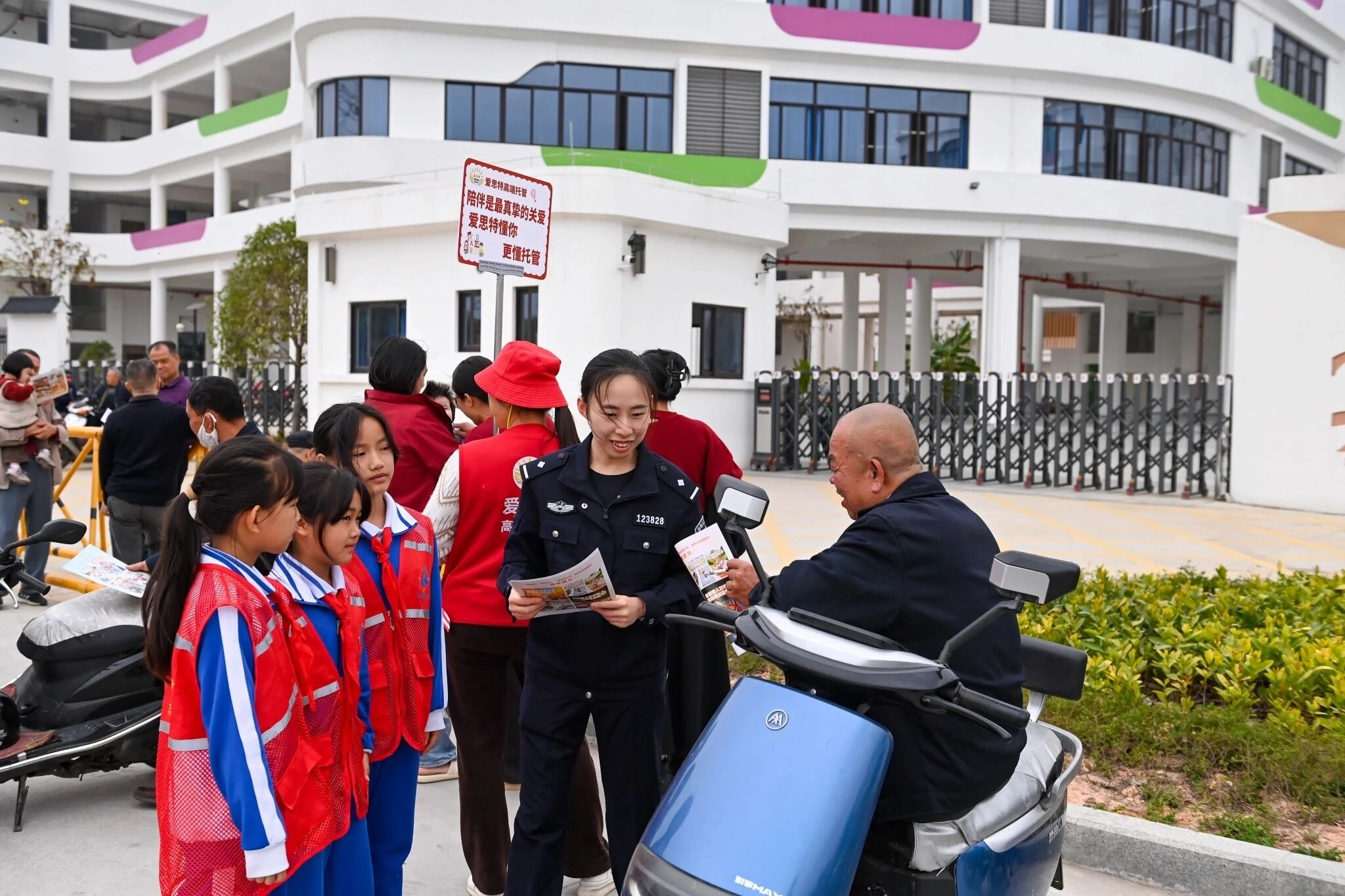放学时分,实验小学汤南校区门口人来车往。人群中,一群身穿红马甲的“小小志愿者”格外引人注目。他们在民警的带领下,用稚嫩却认真的声音,向过往接送孩子的家长们传递着安全出行的理念。