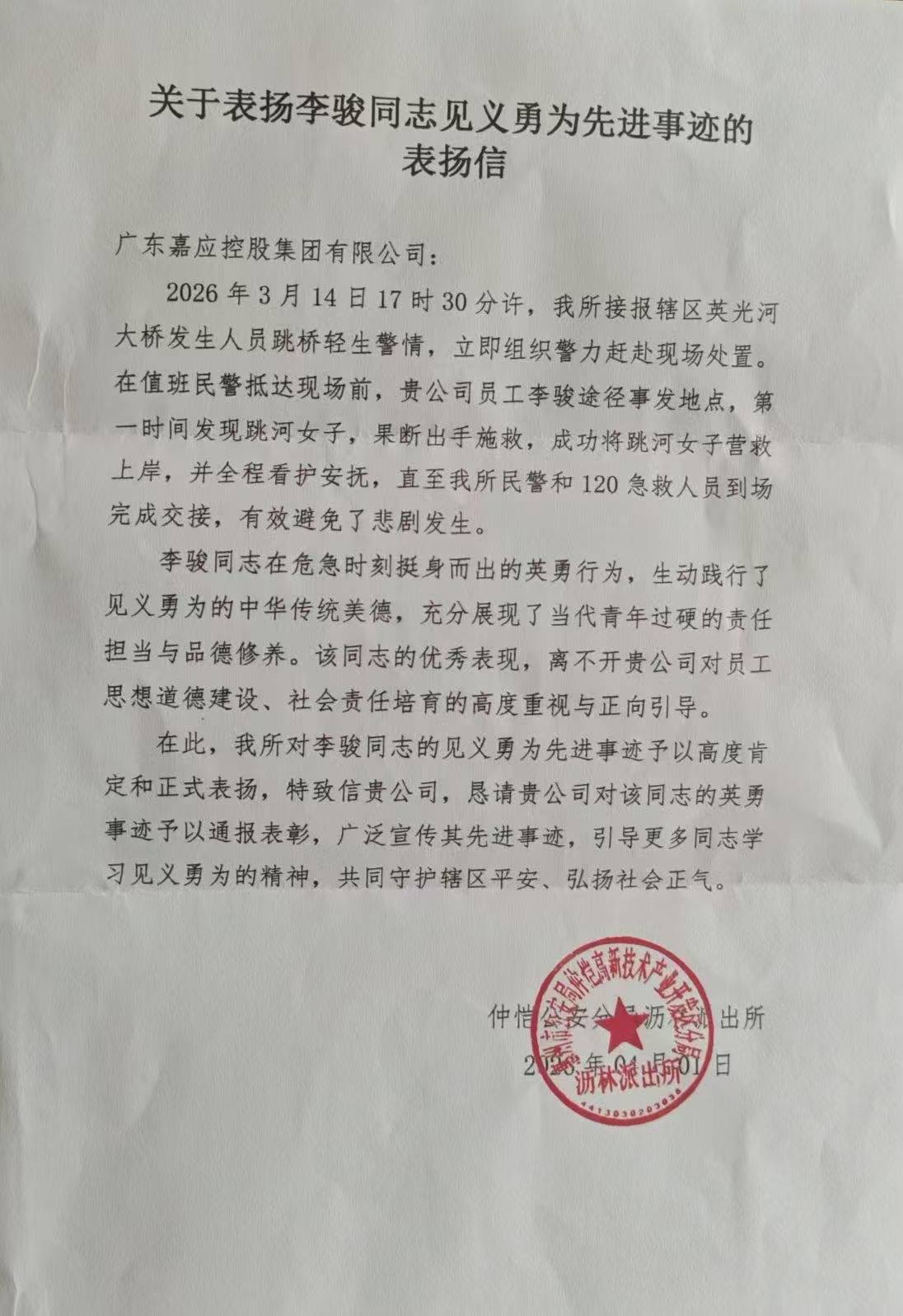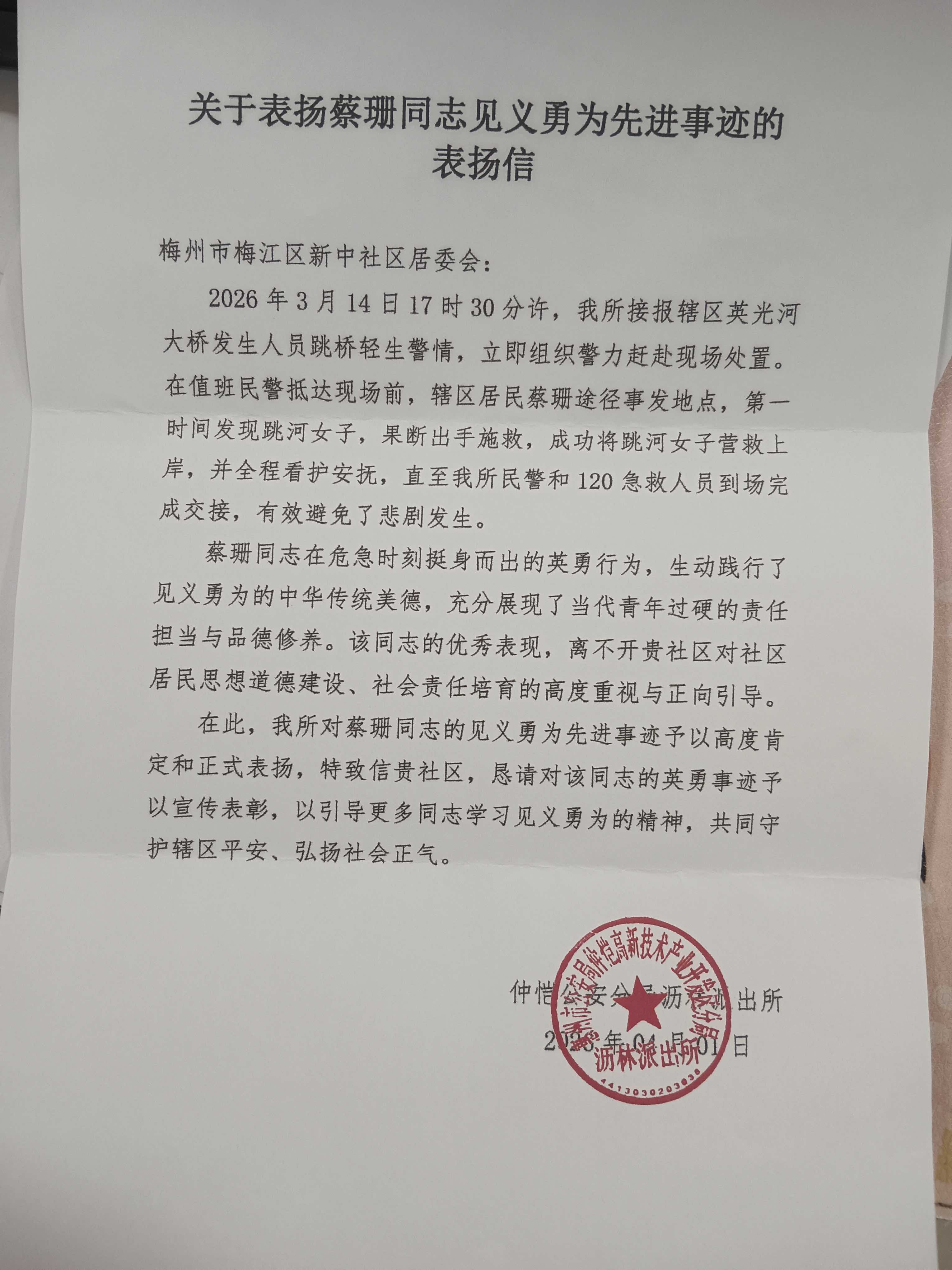 据了解,蔡珊此次在惠州出差,救人后协助民警做了笔录后便匆匆离开,短暂停留后就回梅了。当地派出所为了表彰其与同伴李骏见义勇为事迹,只能将表扬信发送到蔡珊户籍所在地新中社区居委会与李骏工作单位。社区干部收到表扬信后,第一时间致电发信的惠州当地派出所了解事发经过。