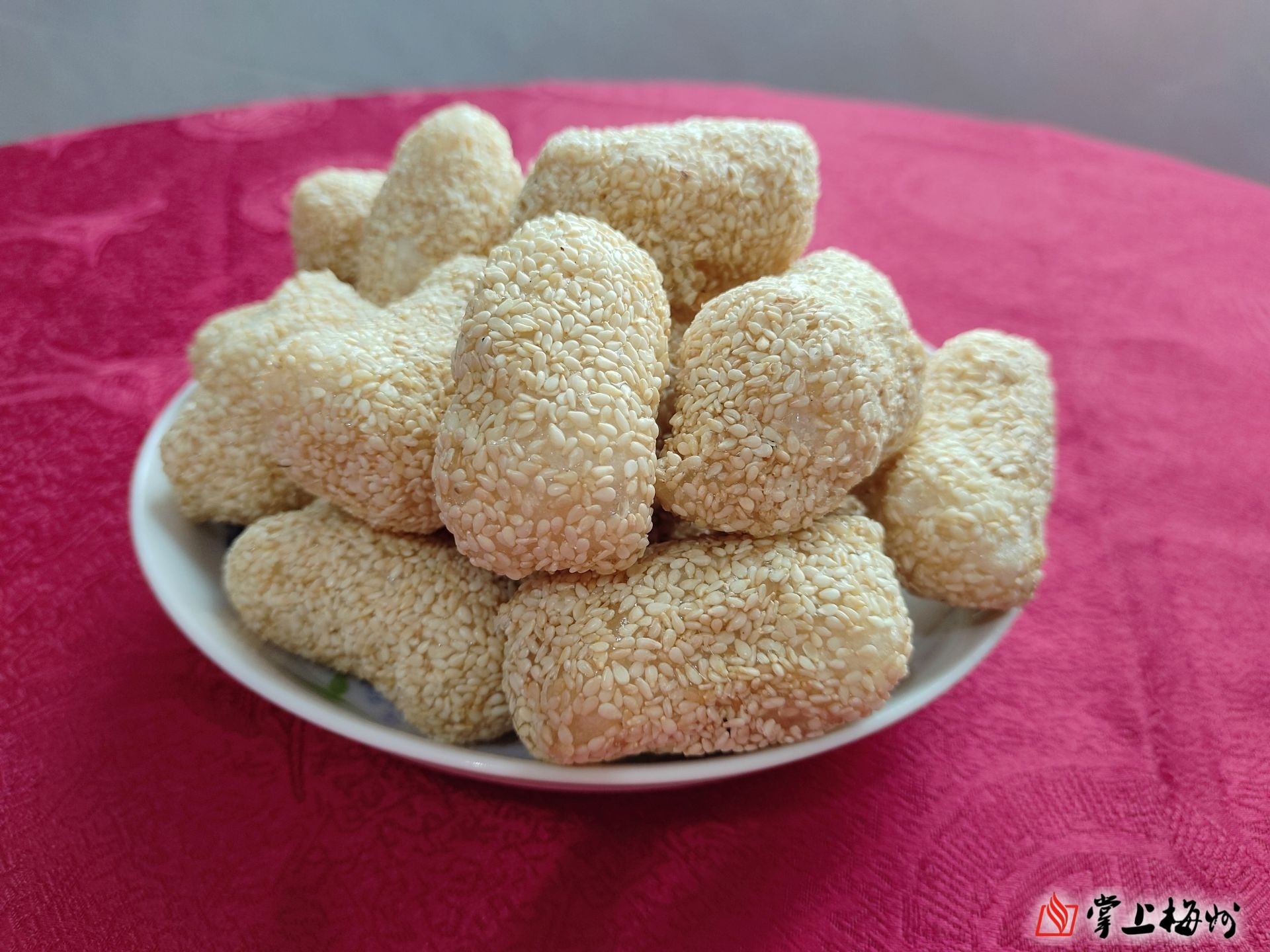 蓼花用糯米、芋头、芝麻等原料制作而成,呈圆鼓槌状,金黄色表皮沾满一层糖浆和白芝麻,里面是雪白的蜂窝状。一口咬下去,“咔嚓”一声,满嘴留香。“蓼花的选料和制作工艺要求都比较高,无论哪个环节出现偏差,都会影响整体的口感、风味。”曾宪强介绍道。