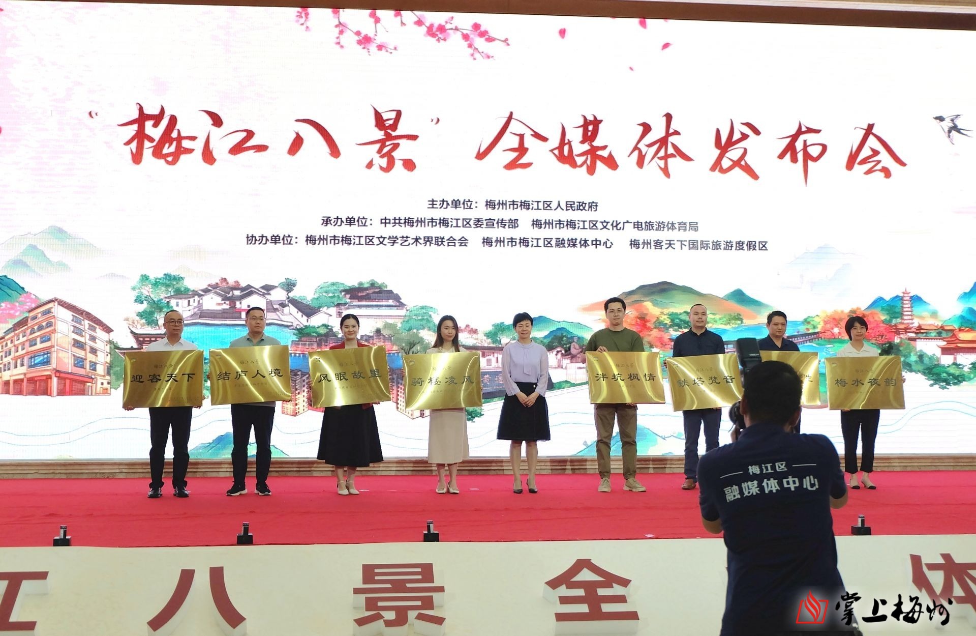 发布会播放了“梅江八景”宣传视频,进行了“梅江八景”自由行精品旅游线路推介。与会领导为8个景区(景点)的属地镇(街)或企业代表颁发“梅江八景”牌匾,并现场启动“客天下杯”梅江八景摄影大赛。大赛面向全社会征稿,作品内容为“梅江八景”范围内的景观特色、社区风貌、生活场景等,征集细则可查看“梅江文广旅体”公众号内容。届时将采取网络投票、专家评审相结合的形式,选出一、二、三等奖及网络人气奖若干名。