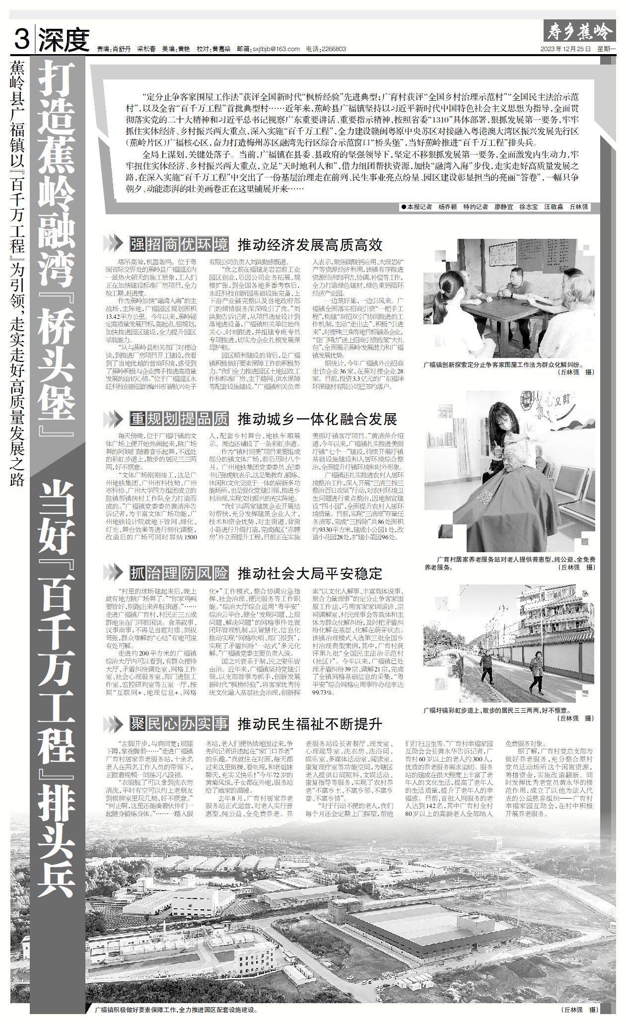 “定分止争客家围屋工作法”获评全国新时代“枫桥经验”先进典型;广育村获评“全国乡村治理示范村”“全国民主法治示范村”,以及全省“百千万工程”首批典型村……近年来,蕉岭县广福镇坚持以习近平新时代中国特色社会主义思想为指导,全面贯彻落实党的二十大精神和习近平总书记视察广东重要讲话、重要指示精神,按照省委“1310”具体部署,狠抓发展第一要务,牢牢抓住实体经济、乡村振兴两大重点,深入实施“百千万工程”,全力建设赣闽粤原中央苏区对接融入粤港澳大湾区振兴发展先行区(蕉岭片区)广福核心区,奋力打造梅州苏区融湾先行区综合示范窗口“桥头堡”,当好蕉岭推进“百千万工程”排头兵。