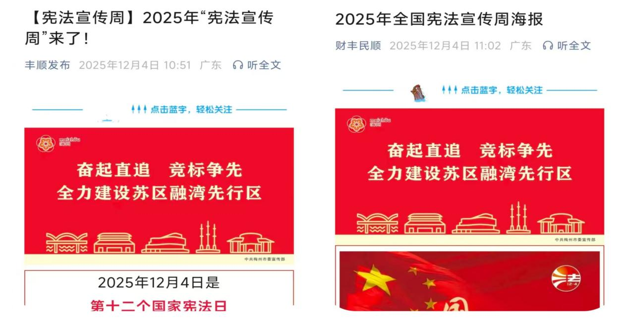 自启动宪法宣传周以来,丰顺县在线下各项普法活动有序推进的同时,还积极利用“丰顺发布”“财丰民顺”等新媒体矩阵,先后发布“【宪法宣传周】2025年‘宪法宣传周’来了”以及“2025年全国宪法宣传周海报”等等,点燃线上普法热情,掀起线上学习宣传热潮。同时,县公路事务中心、县政务服务和数据管理局、县机关事务管理中心等部门在单位LED大屏幕上投放宪法宣传海报,进一步强化全民宪法意识,实现“抬头可见、侧耳能闻、指尖可学”。