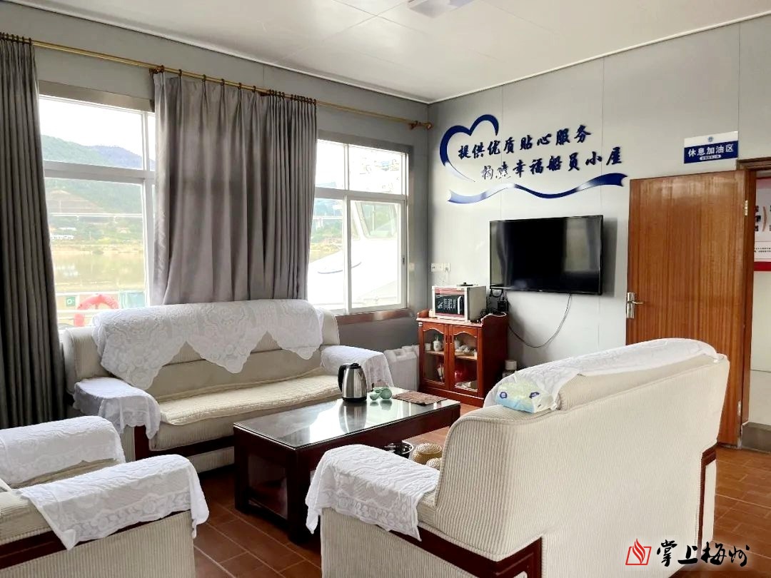该驿站位于梅州市大埔县高陂镇高陂水利枢纽上游“海趸1563”船上,临近船舶候闸区,交通便利且可通过地图软件便捷查询。驿站按一星级标准建成,配备无线网络、休闲娱乐区、临时休憩房等基础设施,提供免费上网、充电、饮水、书籍借阅等基础服务,设有活动宣教区,定期开展船员党员集中学习、水上安全教育等活动。该驿站还创新增设政务服务点,可提供远程网络政务办理、现场指导、政务代办及船舶文书签注等服务,有效减少船员奔波成本。
