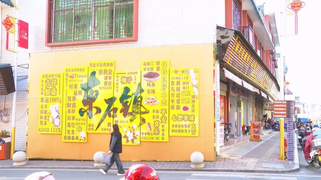 在东石镇主街的网红打卡墙,彩绘以明黄色为底色,把东石镇的特色产业——花生、锅叾茶和新潮的网络热梗、祝福方案结合在一起。