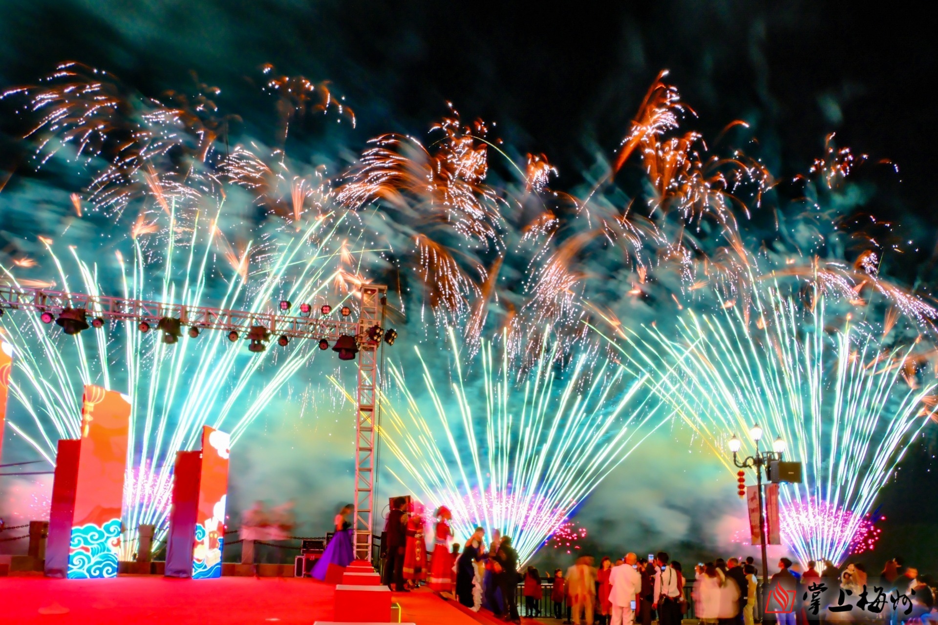 活动现场,领导嘉宾共同参观游览松口古镇的历史建筑、文化景点。在古镇街区观赏客家大锣鼓、舞狮、提线木偶等客家民俗表演,品尝“炸肉丸”“企炉饼”“味酵粄”“金柚果肉奶茶”“柚花奶茶”等客味小吃、潮流饮品;在火船码头乘坐游船感受彼时出海南洋谋生、荣归故里探亲的历史场景;在移民广场深度体验迎亲、送福,挂灯笼、贴春联、唱山歌等年味仪式。随后,在移民广场“大客厅”摆开团圆家宴,品尝传统与创新兼备的客家佳肴。筵席期间,还观看了2025年“松口古镇”专题摄影大赛获奖作品展和“2026客家春晚”演出。活动最后以壮观绚丽的无人机、焰火表演照亮古镇夜空、喜迎春节,为八方客侨同步呈现了一场精彩的视觉盛宴。
