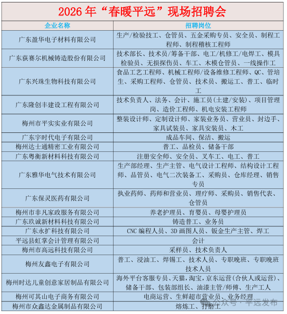 为全面贯彻党的二十大和二十届历次全会精神,认真落实党中央、国务院关于稳就业、稳企业、稳市场、稳预期的决策部署,按照省人力资源和社会保障厅《关于开展2026年“南粤春暖”行动的通知》要求,平远县人力资源和社会保障局联合县有关单位,定于2026年2月21日(星期六,年初五)上午,在平远县人民广场举办2026年“春暖平远”大型现场招聘会。