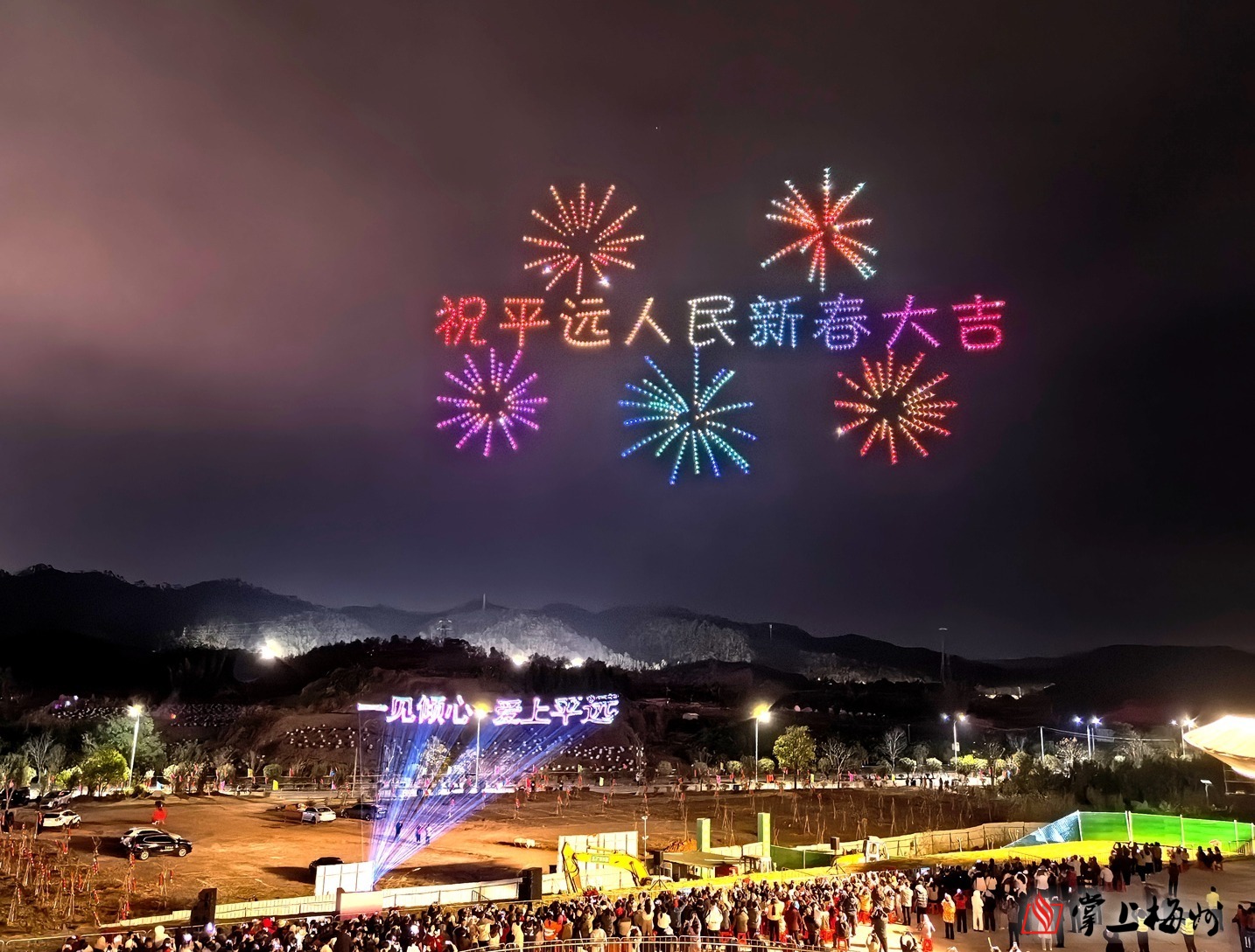 “万马迎春 福满平远”2026平远县春节无人机表演和新春灯光秀在大佛寺周边亮相。(吴辉燕 摄)