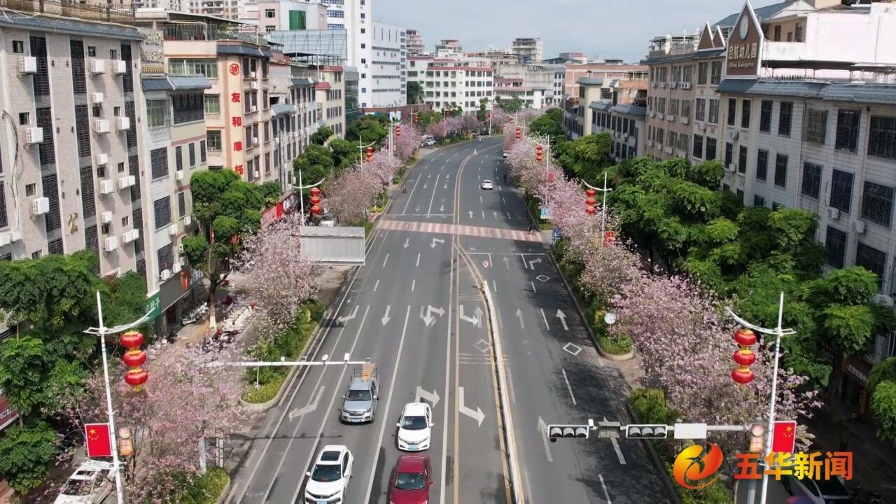 日前,记者在五华县水寨大道看到,道路两旁宫粉紫荆、粉白相间的紫荆花沿街绽放,远远望去,繁密的花朵缀满枝头,仿佛一片绚烂的紫红色云霞。微风拂过,几片花瓣轻轻飘落,像是春天寄来的信笺,诉说着生机与希望。
