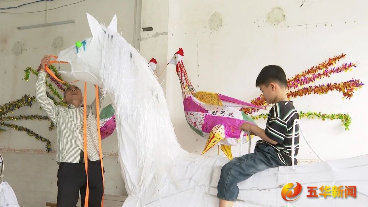 【五华县非物质文化遗产“下坝迎灯”县级代表性传承人 周月明:今年马年 我就做条马灯这个形状比较独特,比较难做的手艺,因为传统就是年年添新丁,从去年开始准备,首先竹子要找到好的来,破好竹子后晾干(接着)从自己思维范围上构思做出来做的,(比较困难的是)做活动,本身篾、纸都是脆弱的,但是做出弹性的效果就这点很考究,这个考究首先就是要用拉力弹簧,力大力小,要衡量出马的重量和出来,所以一定要调试到均衡。】