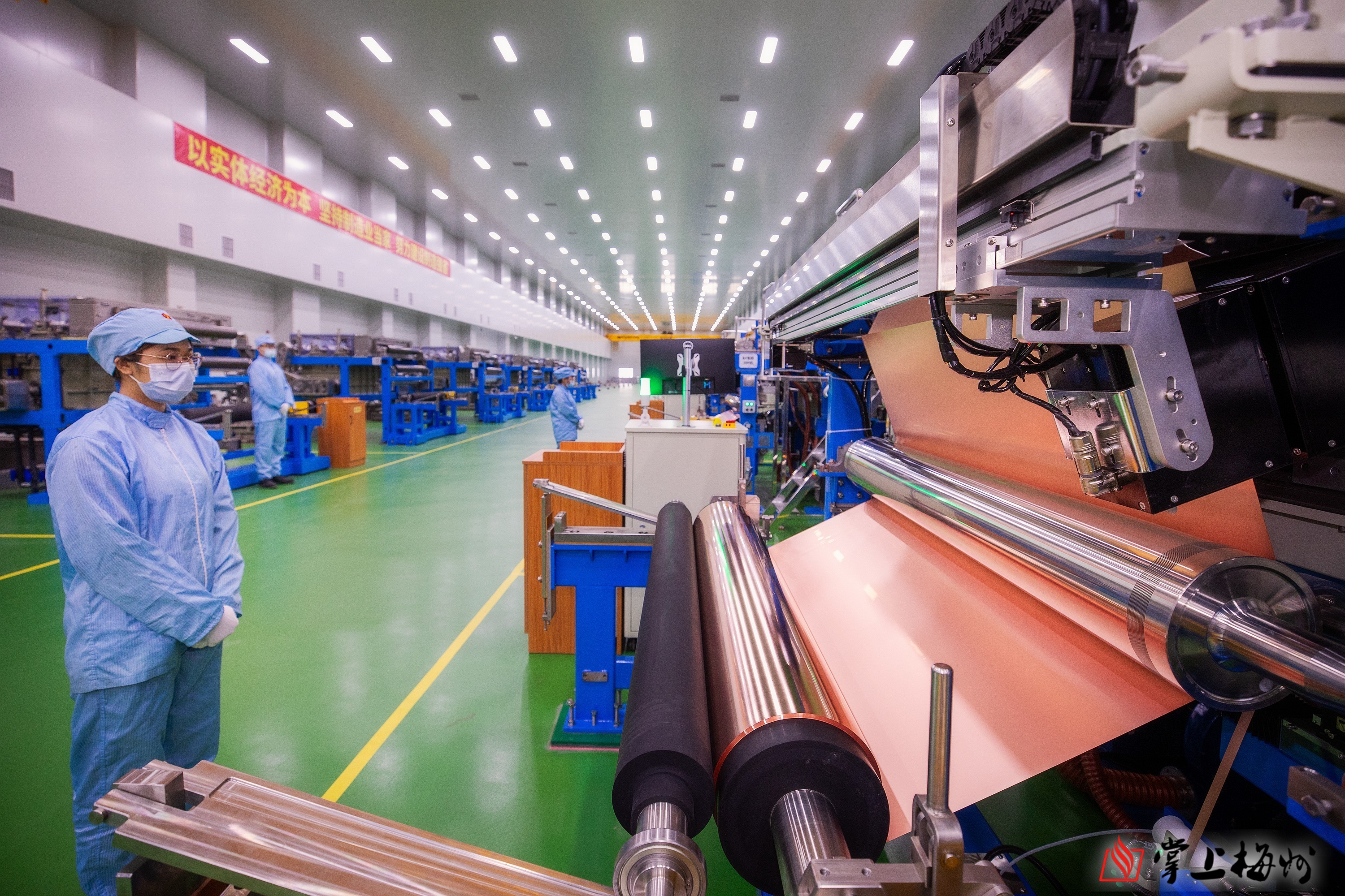 在广东嘉元科技股份有限公司生产车间,一张张薄如蝉翼的铜箔沿着轮轴滚卷而出。(连志城 摄)