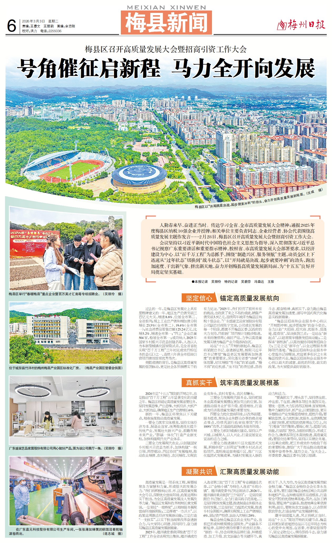 高质量发展是一项系统工程,需要凝聚各方智慧和力量,形成强大的发展合力。“我们将积极响应省、市、区高质量发展大会号召,深耕优化营商环境、政策运用和实干担当,为全区高质量发展注入发展改革力量。”梅县区发展和改革局局长黄文辉说,一是架设“一座桥梁”,以精细服务展现营商环境新面貌;二是厚植“一方沃土”,以政策运用激活经济发展新动能;三是打造“一支铁军”,以实干担当凝聚改革奋进新合力,与大家同心同德、同向同行,奋力谱写梅县区高质量发展新篇章。