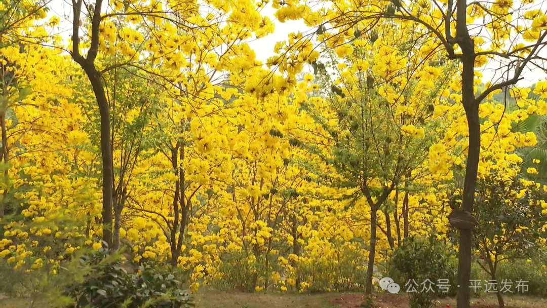 近日,平远县城街头巷尾、公园绿地的黄花风铃木已悄然进入盛花期。簇拥枝头的金黄花朵如串串风铃般悬挂,满树璀璨,为县城披上了一袭耀眼的“金甲”。