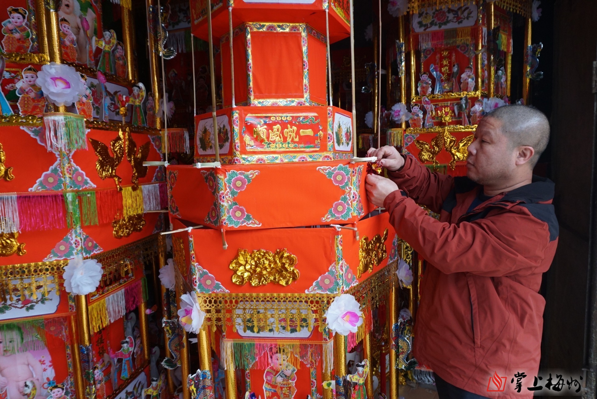 这些寓意并非一成不变,而是随着时代发展不断丰富。早年花灯装饰中白花数量多于红花,凸显添丁祈愿。如今红花与白花并重,体现了男女平等的新时代理念。“兴宁花灯的装饰物并非单纯审美元素,而是客家人生育信仰、宗族意识、祈福文化的集中体现,是连接传统与现代的文化纽带。”黄红亮说。