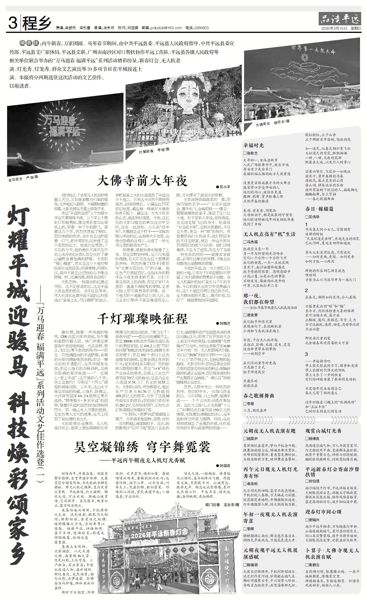 时维丙午,序属孟春。朔夜星繁兮隐曜,玄穹开挂兮传神。天幕茫茫兮铺笺作画,华光耿耿兮挥笔耕耘。布无人机之雄阵,呈灯光秀之奇观。平远胜境,灯火凝昕。佛光大道,万众欢欣。斯诚山城首演,艺苑新芹。自戌逮亥,观者如云,莫不叹为观止。