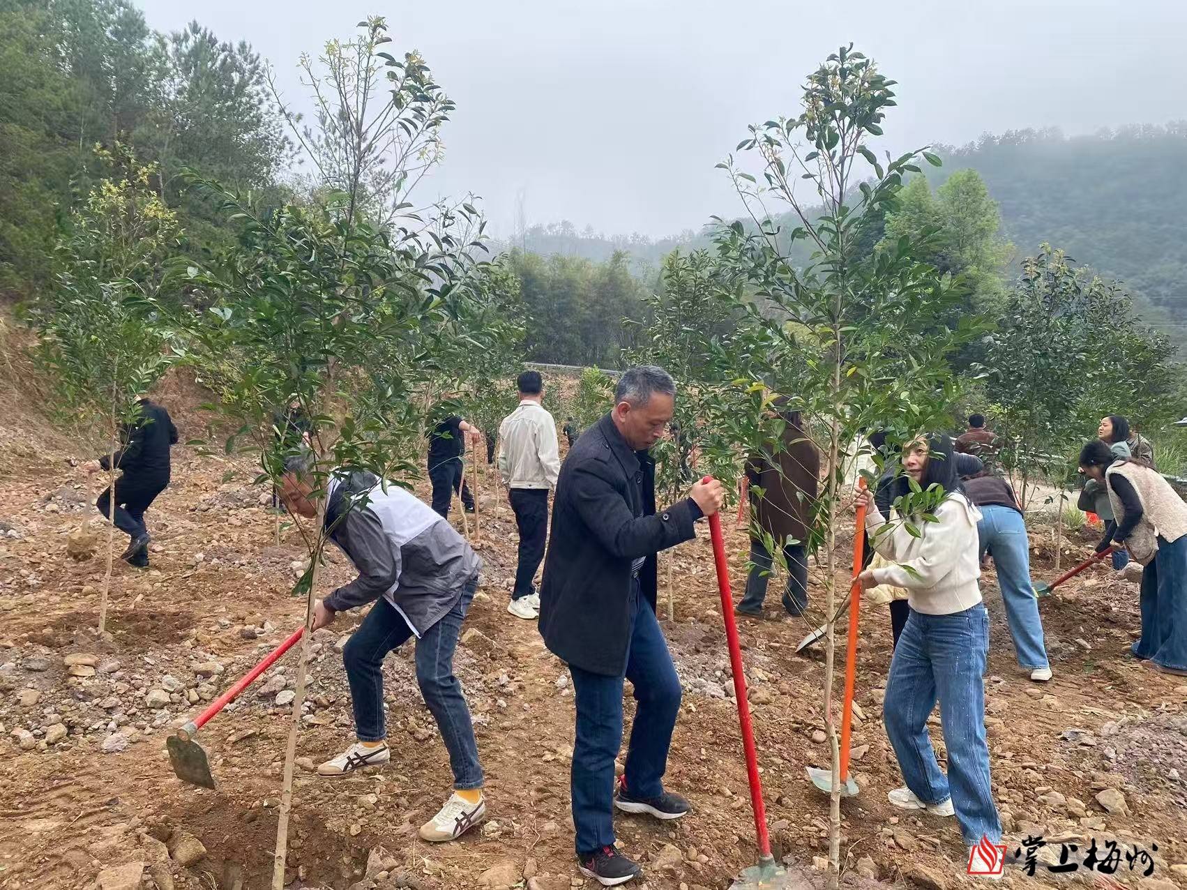 掌上梅州讯 迟日江山丽,春风花草香。为认真落实省、市“百千万工程”和乡村绿化三年行动计划部署,近日,梅江区城北镇在干才村干才水库旁开展2026年全省乡村绿化主题植树活动。城北镇领导班子成员、镇各村(社区)党组织书记及干才村当地群众等50余人参加,为城北增添一片生机勃勃的新绿。