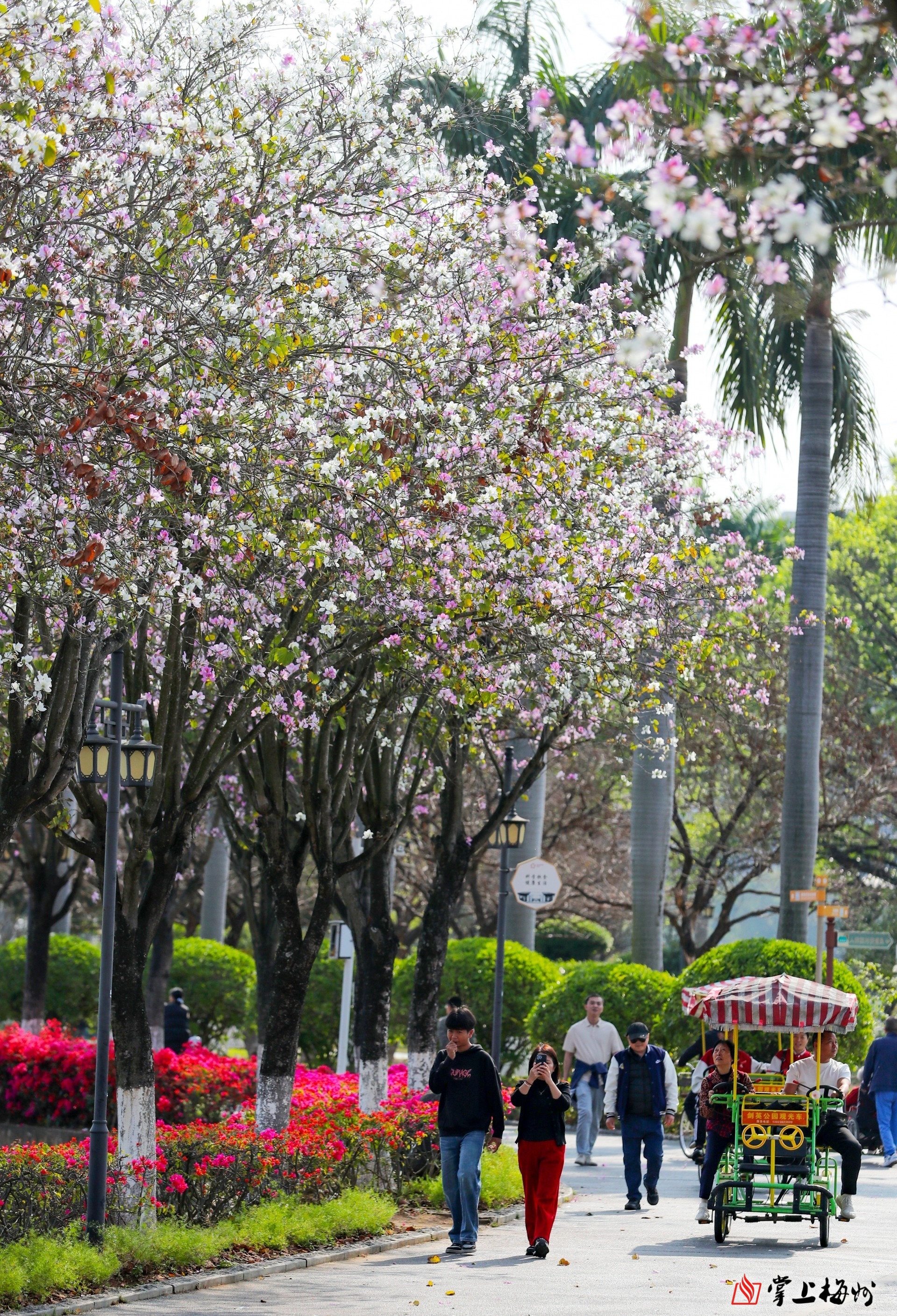除了乡村的缤纷花海,梅江城区同样春意盎然。剑英公园内,粉紫相间的紫荆花缀满枝头,三角梅热烈绽放,与葱郁的绿植、整洁的步道相融相映。市民们漫步休闲、骑行赏景,在满城春色中尽享惬意时光。