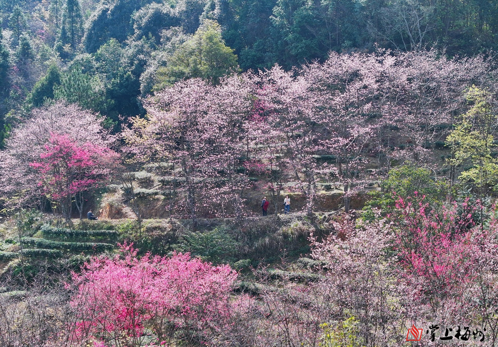 二月初,西阳镇明山嶂板盖坑春意渐浓。海拔约800米的樱花园内,上千株樱花依山而植,从板盖坑蔓延至上炉肚、明山茶场。樱红与浅粉相间的花朵满树绽放,层层叠叠缀满枝头,宛如绚丽彩霞萦绕山腰,成为高山上一道亮眼的春日盛景。