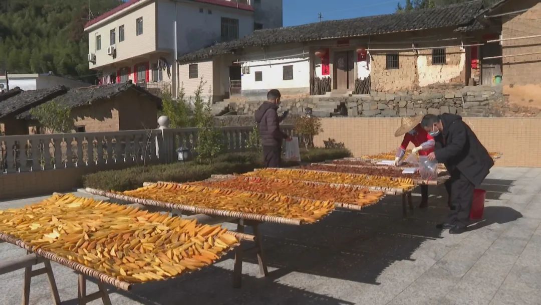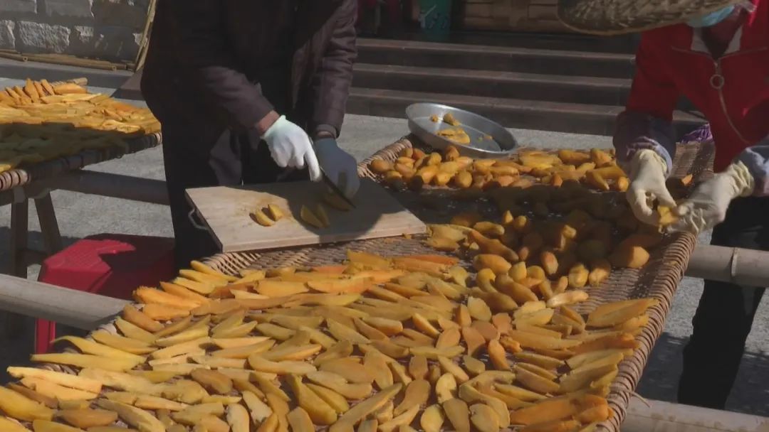 走进古丁村,许多农户家门口一排排的竹垫上摆满了红薯干,色泽鲜艳透亮,在阳光的照耀下金光灿灿,飘散出诱人的香甜。马阿姨是村里红薯干制作大户,只见一条条刚出炉的红薯在她手上变成均匀的条块状,整齐沐浴在阳光下。